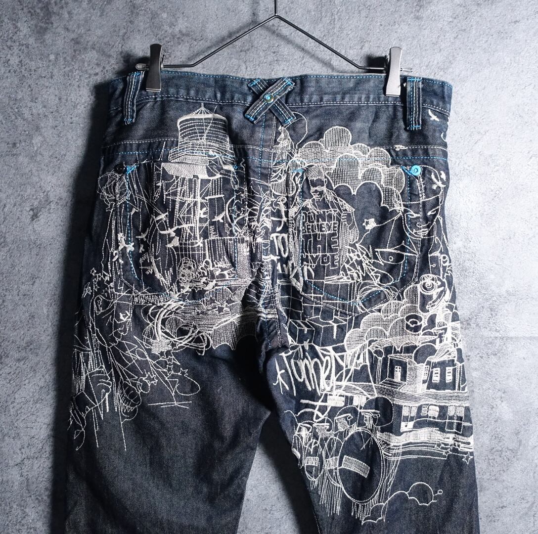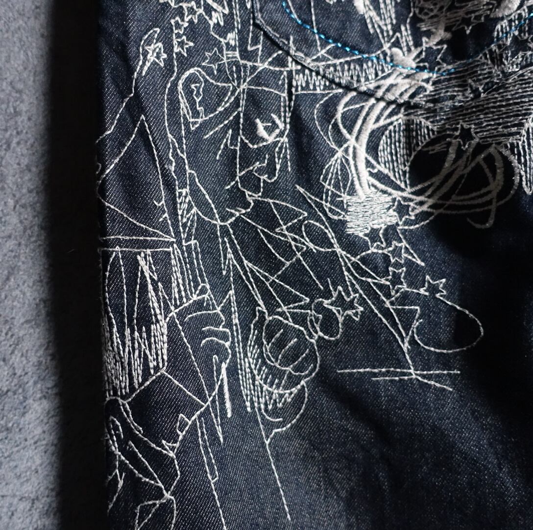 インディゴデニムをベースにバックに様々なヒップホップテイストなモチーフ刺繍を緻密に施した凝りに凝ったスペシャルなデザイン。