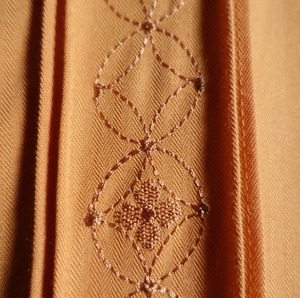 絶妙な色味のオレンジをベースに同色の幾何学的なモチーフ刺繍を施した洒落たデザイン。