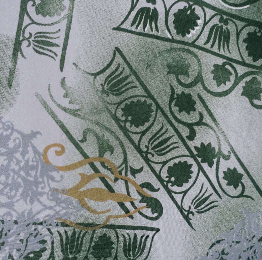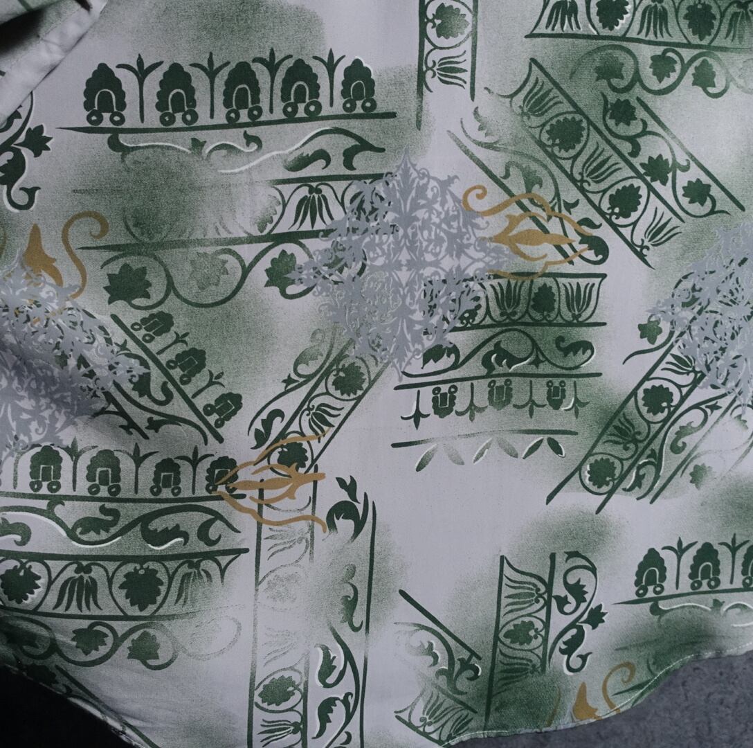 ボタニカル柄を全面にあしらい、さらにグレーのオーナメントモチーフを所々にあしらった凝ったデザイン。