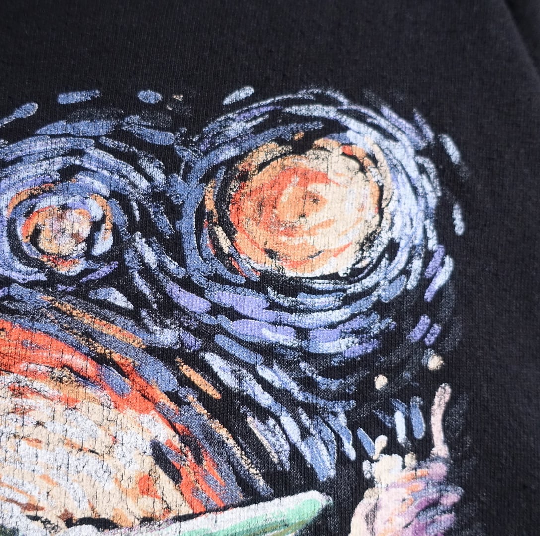 ブラックをベースにベビーヨーダ(グローグー)をゴッホの絵画のように描いたアーティスティックなプリントデザイン。