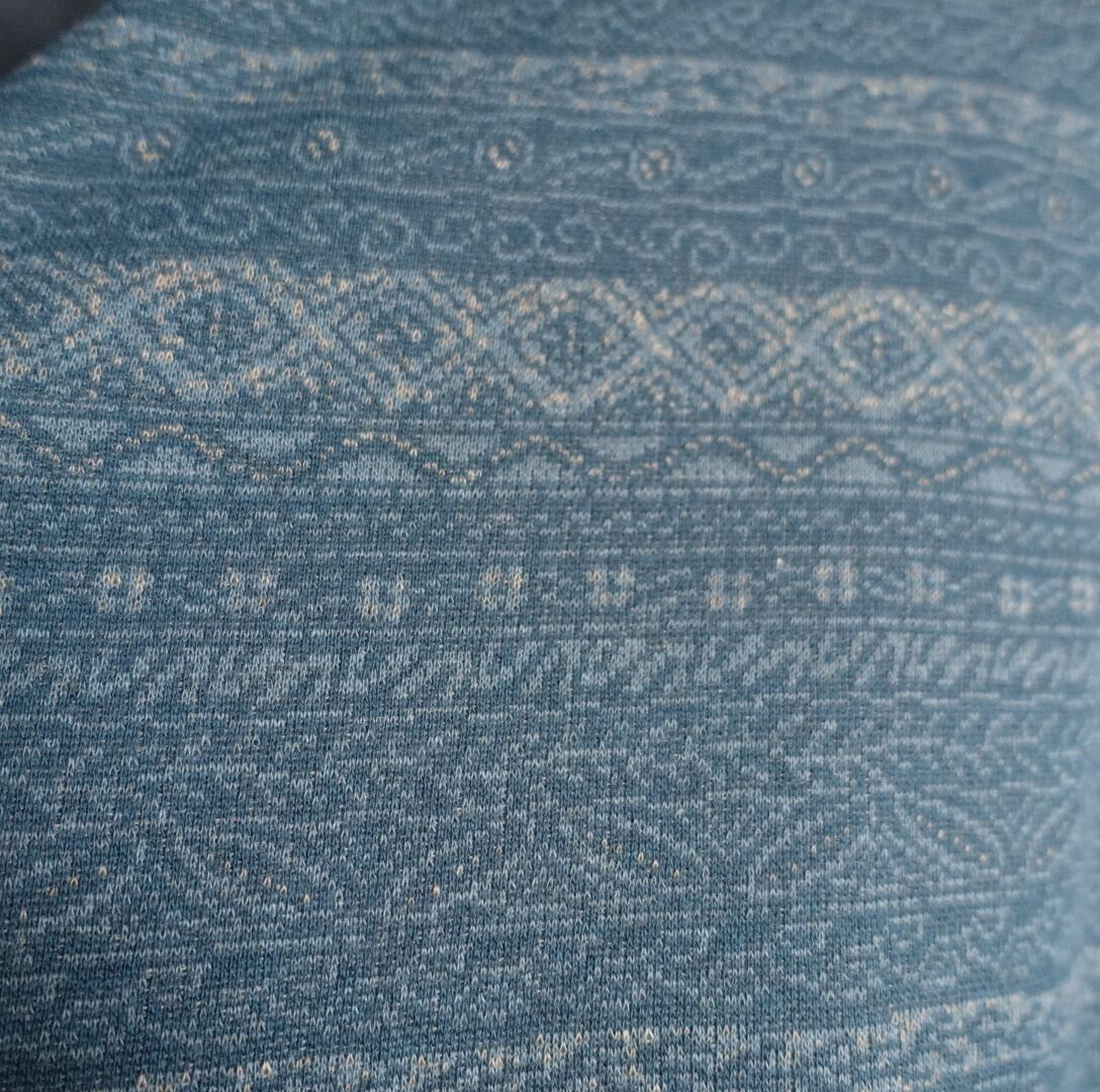 抽象的な様々な柄をボーダー状に全面にあしらった洒落たデザイン。
