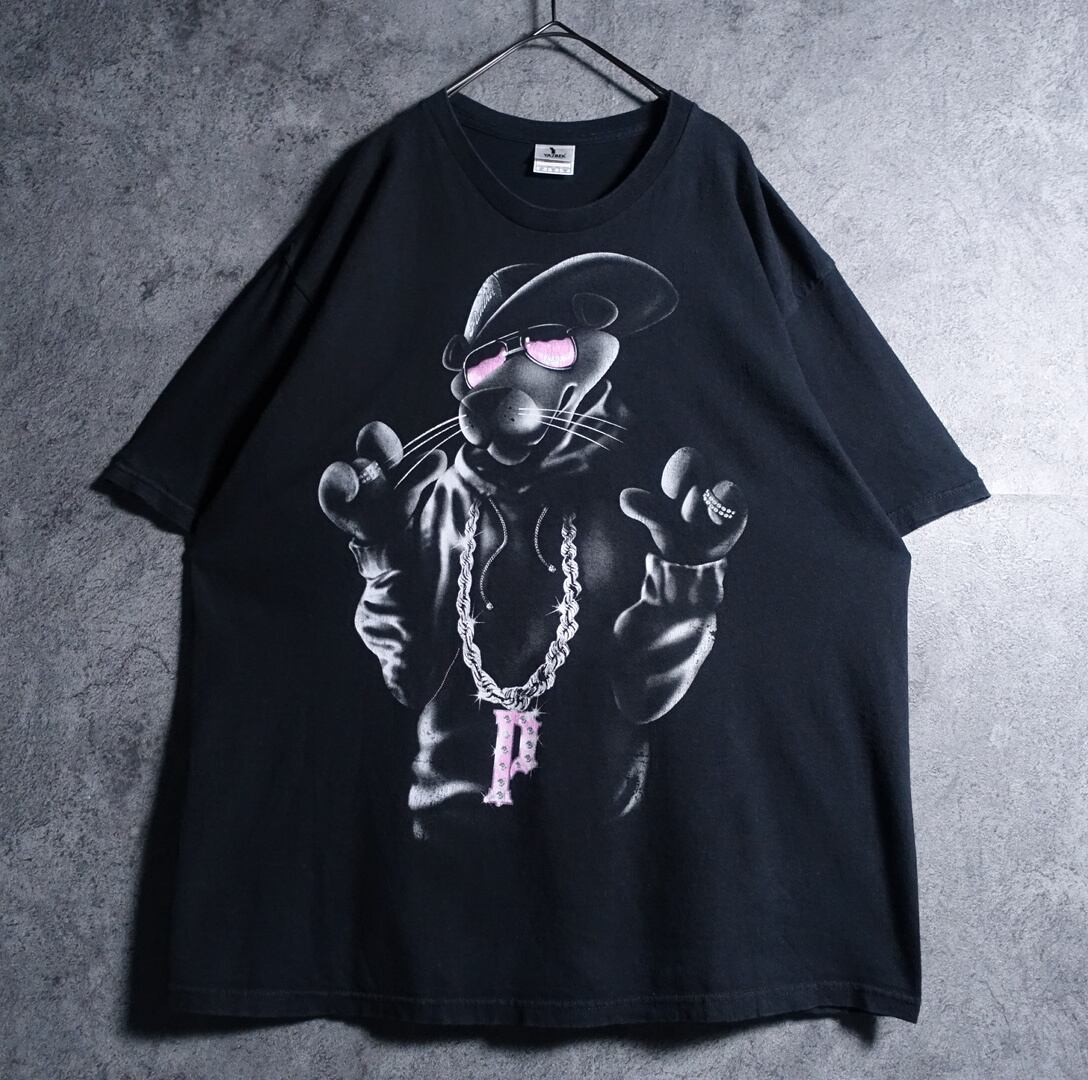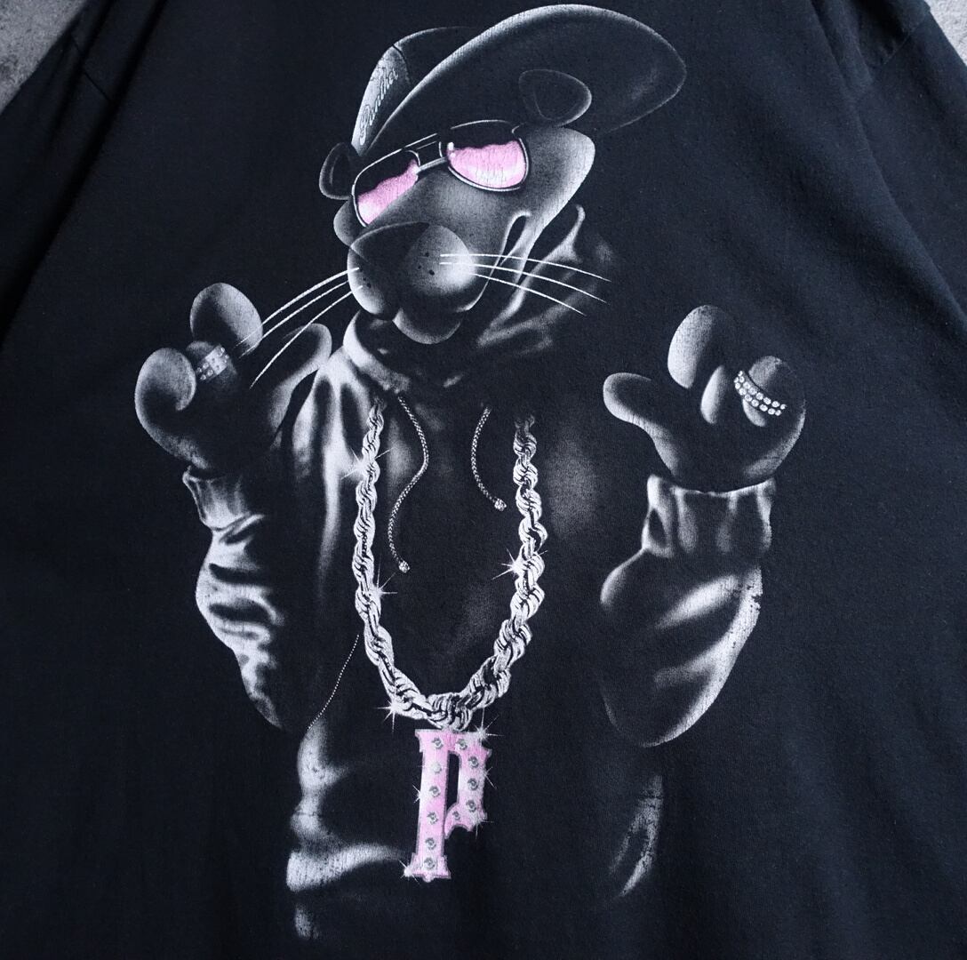 キャップやサングラス、ごつめのリング、ネックレスをしたストリートスタイルなピンクパンサーを大きくあしらったデザイン。