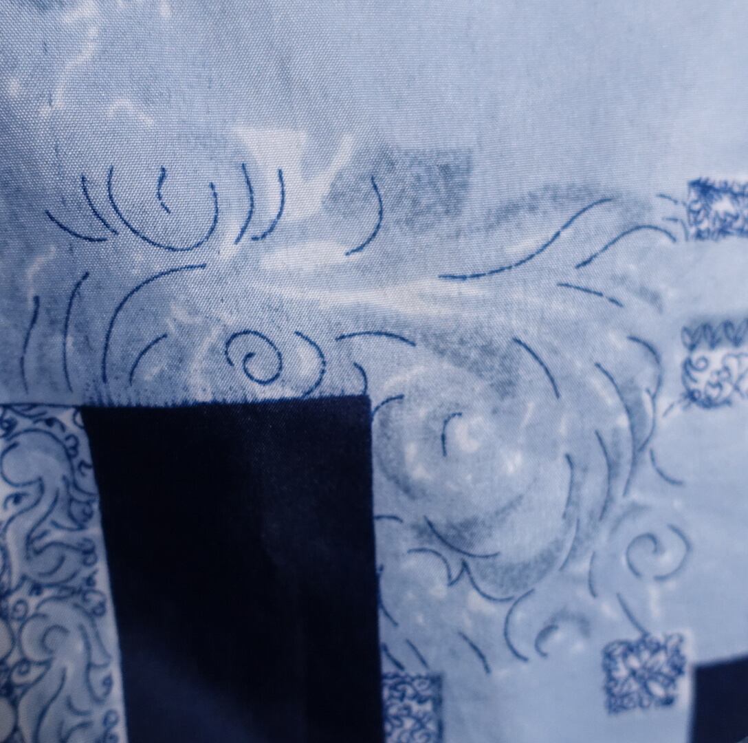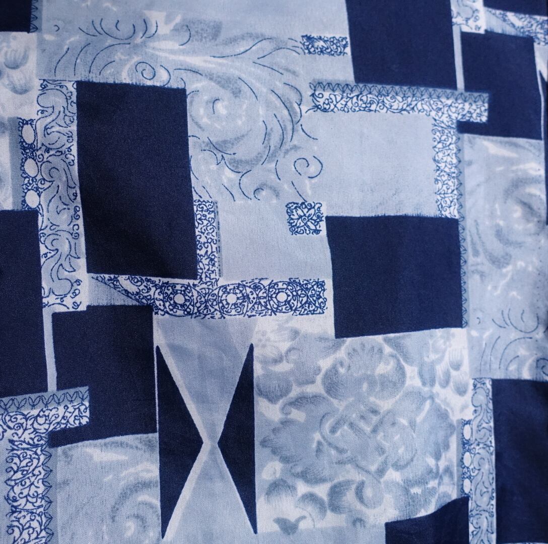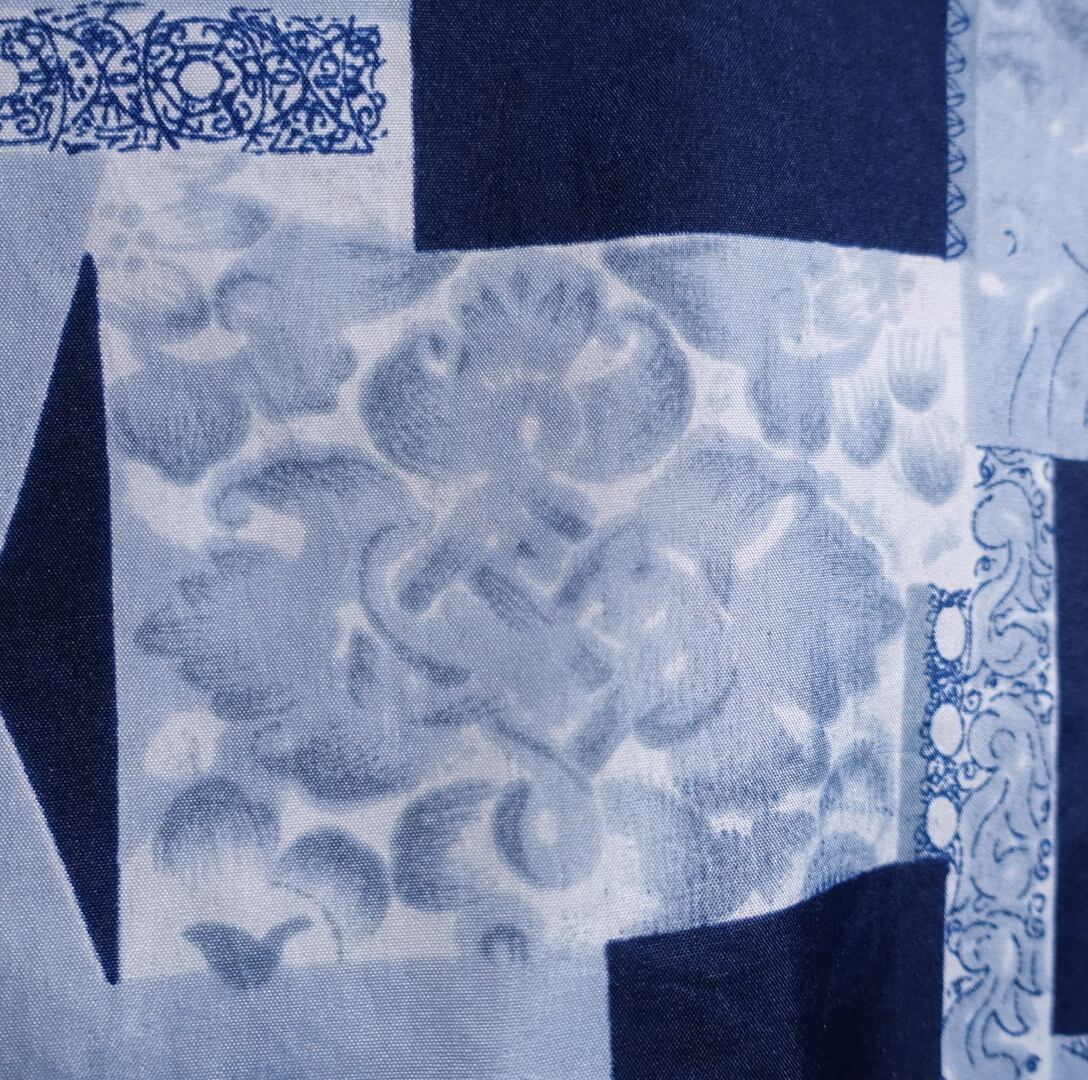 様々な抽象的な柄とブルーのブロックをパッチワークのようにバラバラに組み合わせた洒落たデザイン。