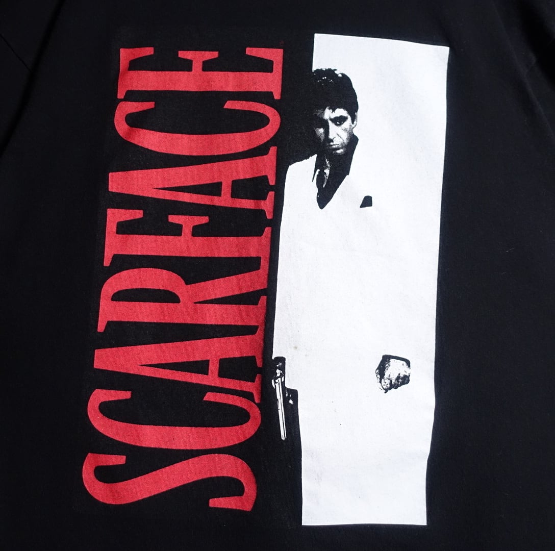 フロントに主人公のトニーモンタナとSCARFACEのロゴを縦に大きくあしらったグットプリントデザイン。