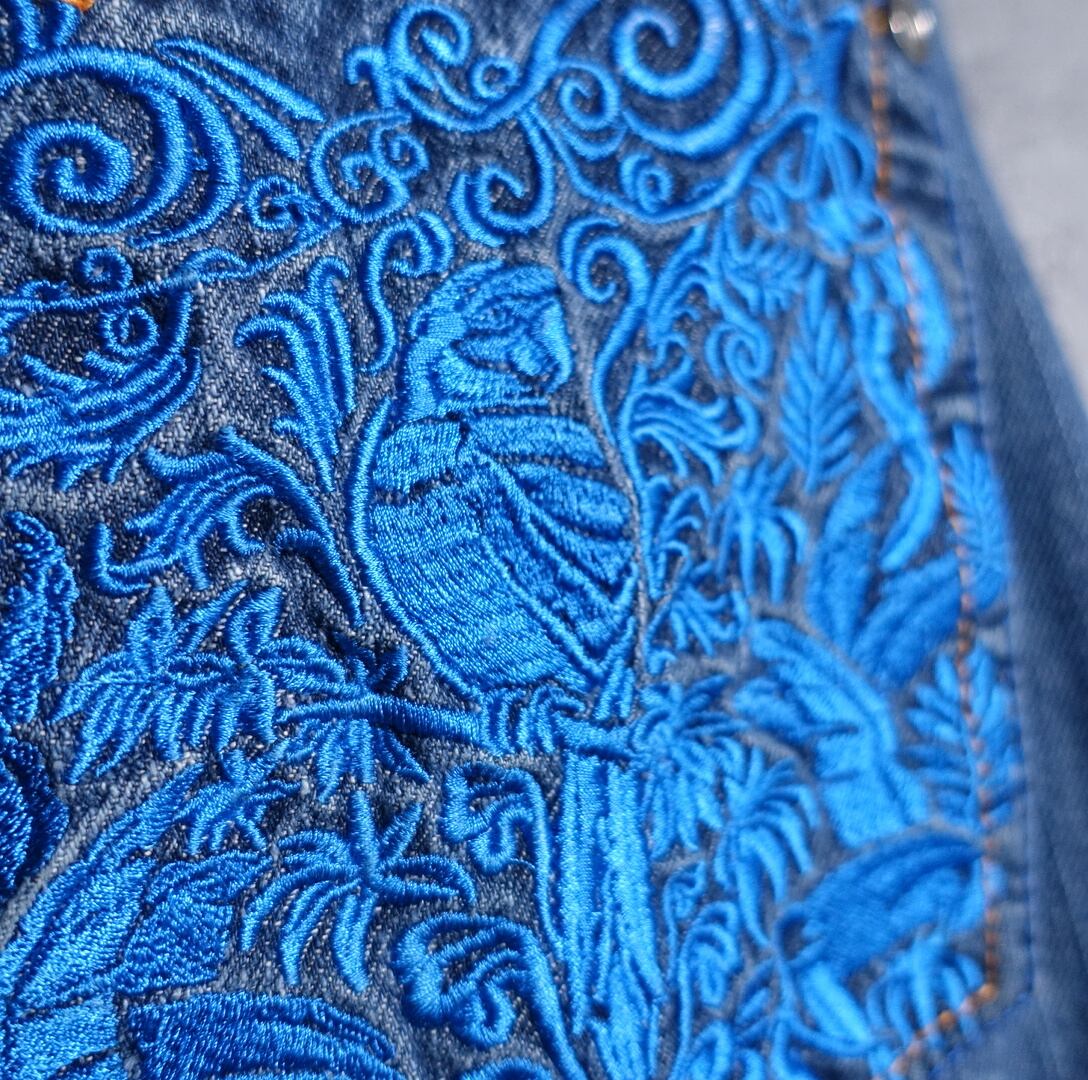 デニムをベースにバックポケットにオウムとボタニカルモチーフをゴールドとブルーの刺繍で施したスペシャルなデザイン。