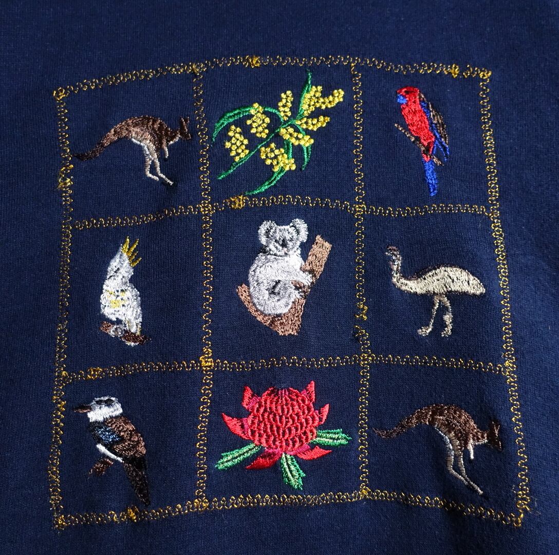 フロントにカンガルーやオウム、コアラなどのアニマルモチーフと花のモチーフを全て刺繍で施したこり凝ったグッドデザイン。
