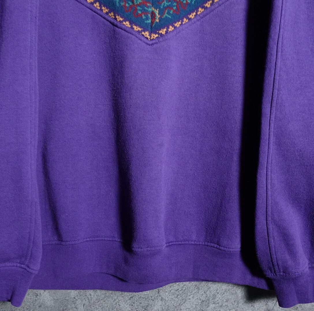 パープルをベースに肩から中央にかけて抽象的な柄のニットとナイロンの切替を施した珍しいデザイン。