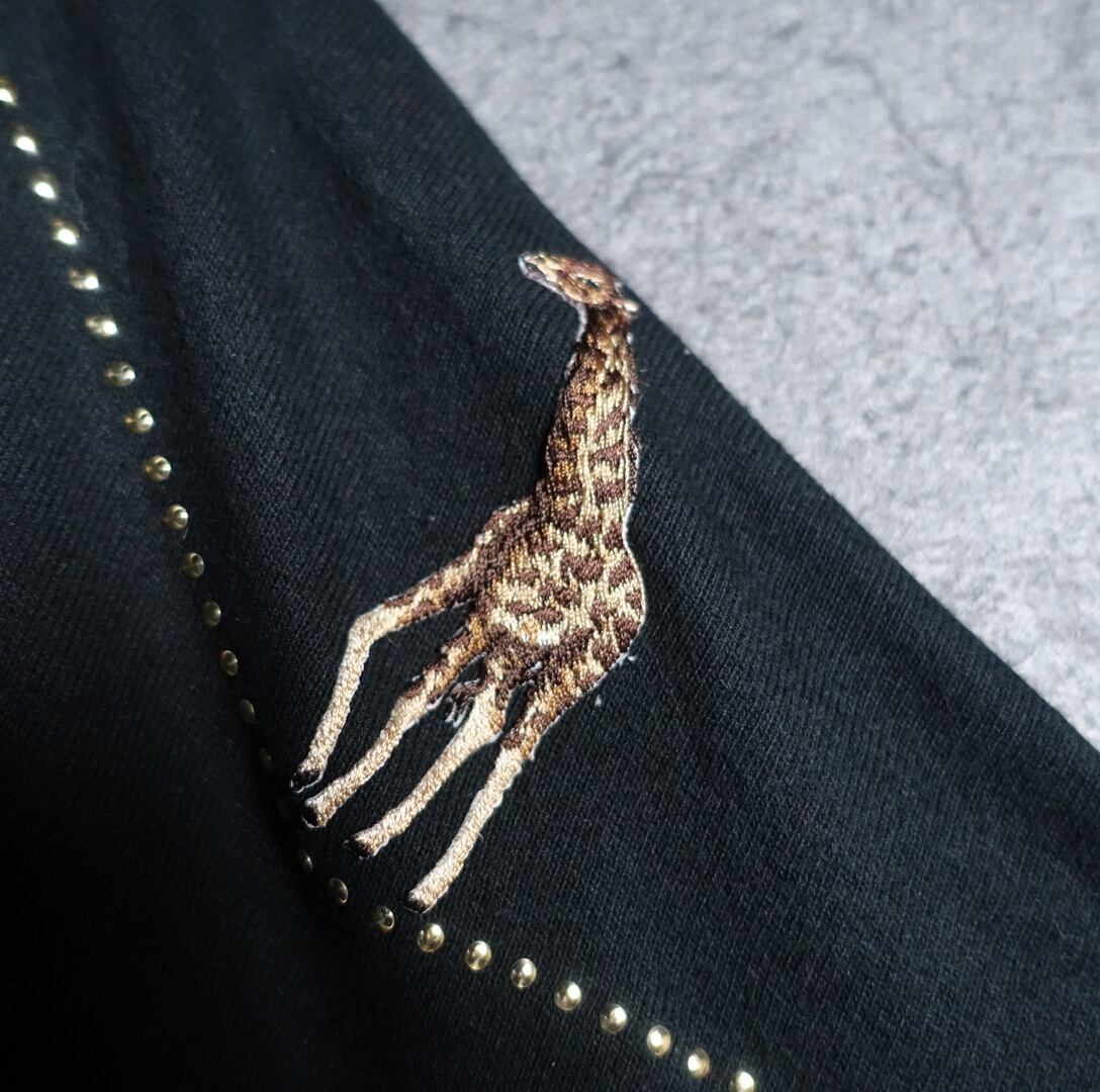 両肩にはキリンとシマウマの刺繍とスタッズが施されており◎