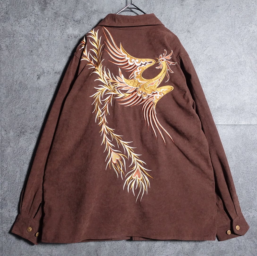 光沢感のあるスムース生地に美しく大胆なフェニックスの刺繍が後ろ見頃から前見頃まで施されたスペシャルなデザイン。