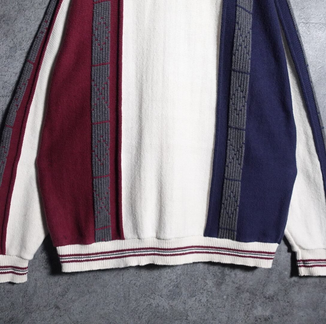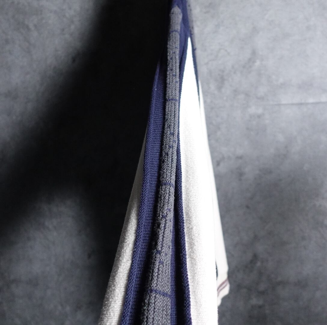 袖、見頃にブルーとワインレッドの切替とグレーの立体感のあるニッティングを施した凝ったデザイン。
