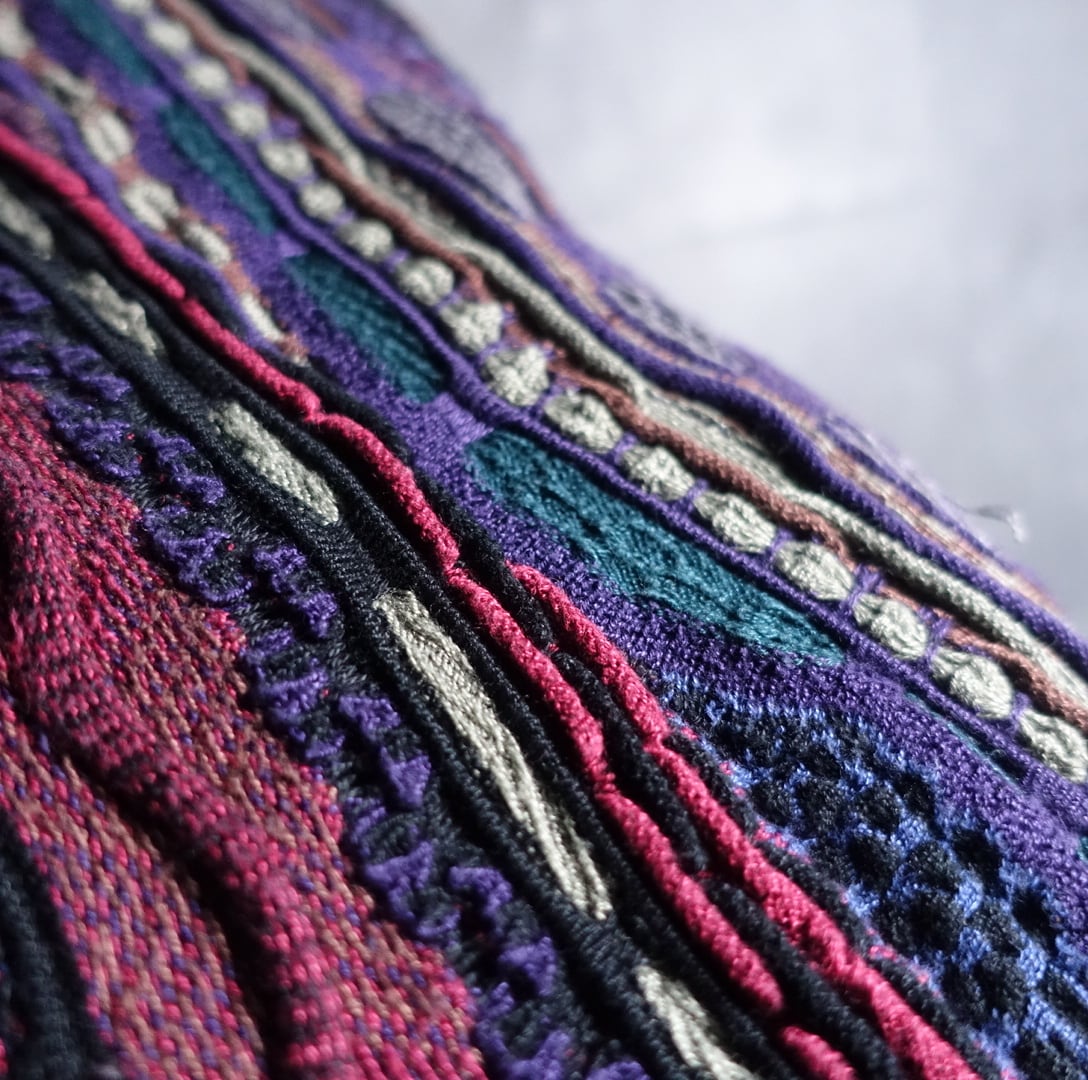 パープル、ブラック、グリーン、ブラウンなどの3Dニットでは比較的珍しい毒々しさのあるグッドマルチカラーリング。