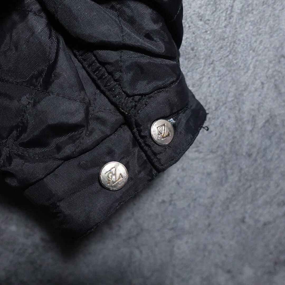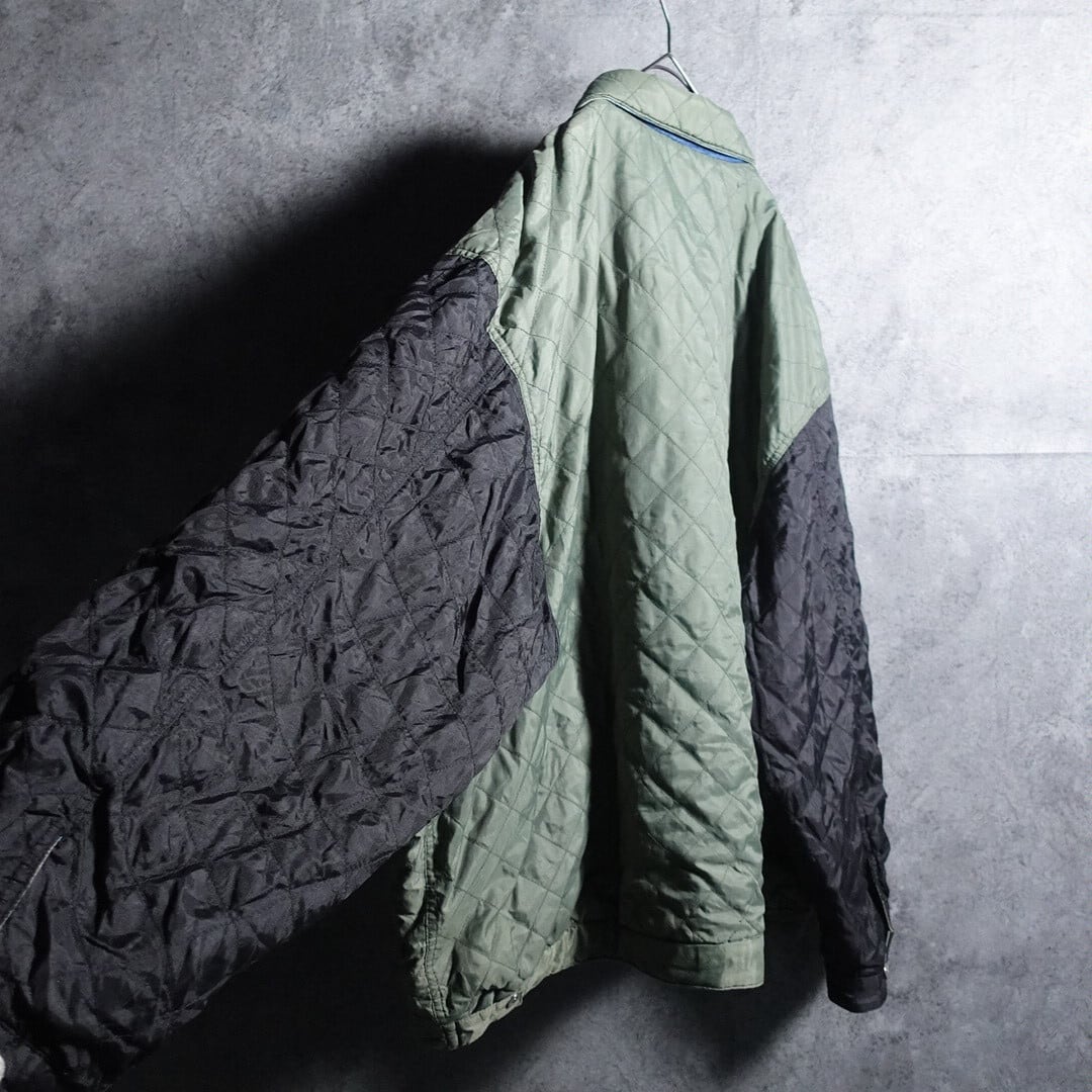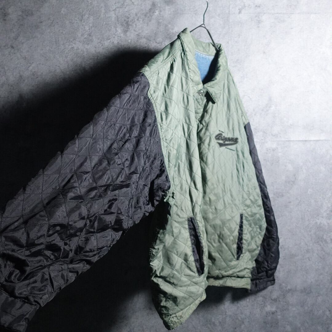 キルティング面はグリーンをベースに袖とポケットをブラックに切替、左胸にブランドの刺繍ロゴを施したデザイン。