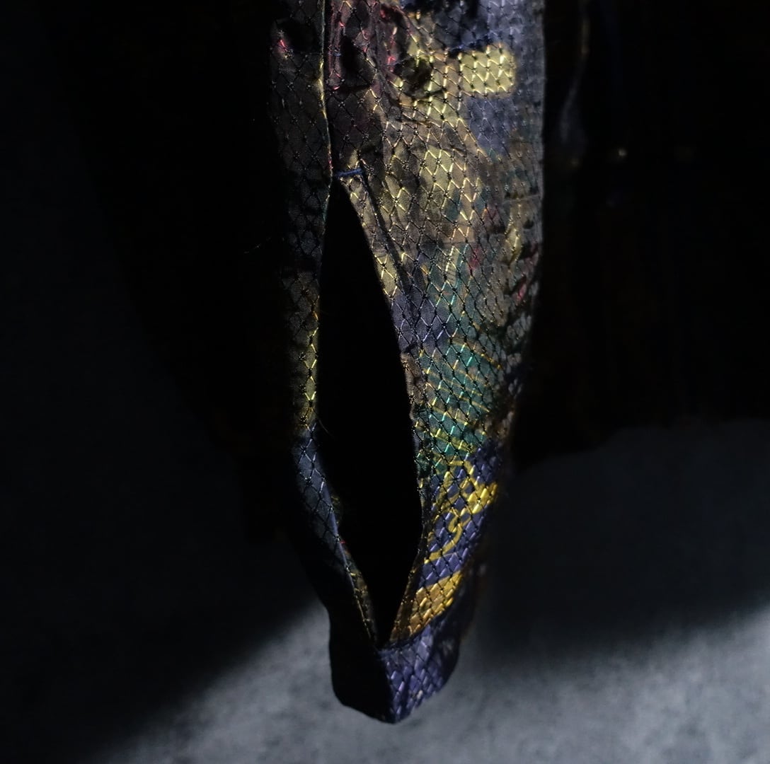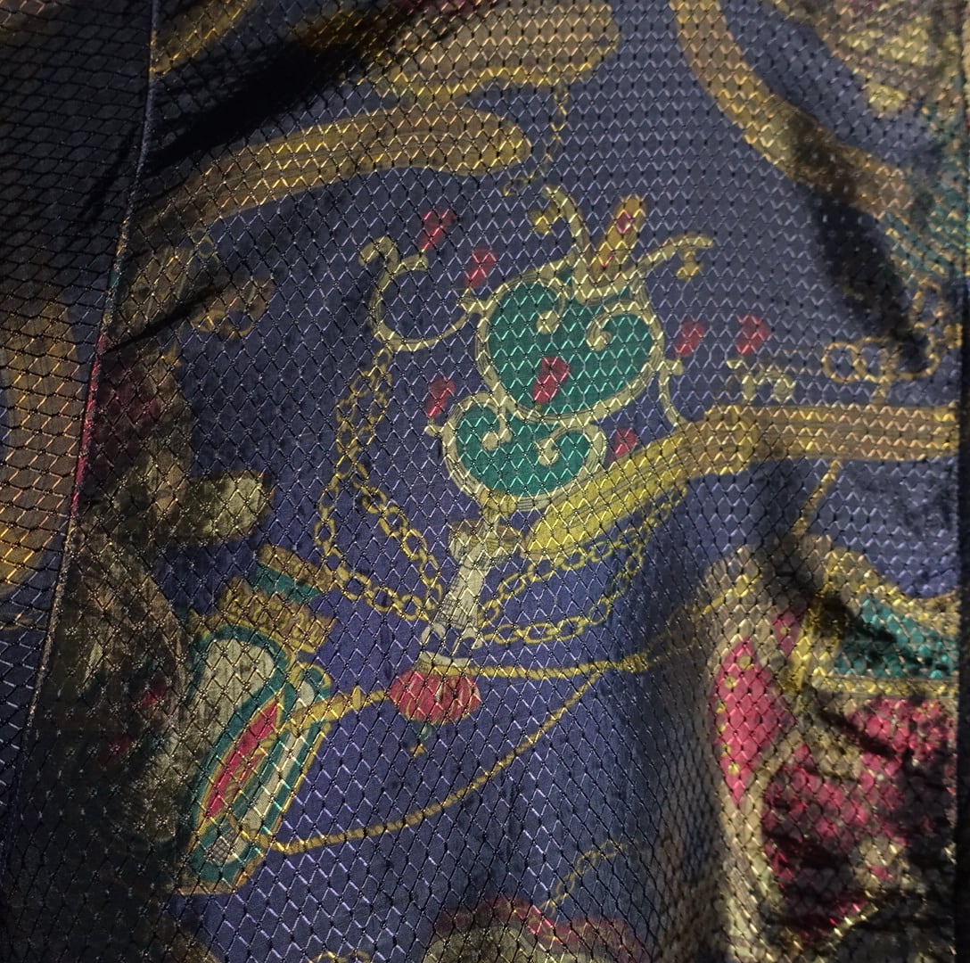 絶妙な色味のダークブルーをベースに様々なオーナメントやチェーンのモチーフを全面にあしらったスカーフ柄デザイン。