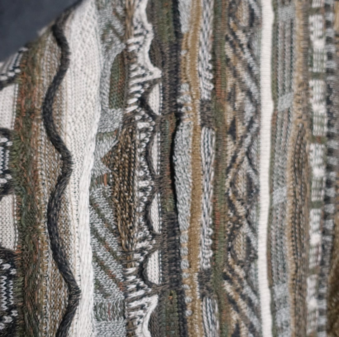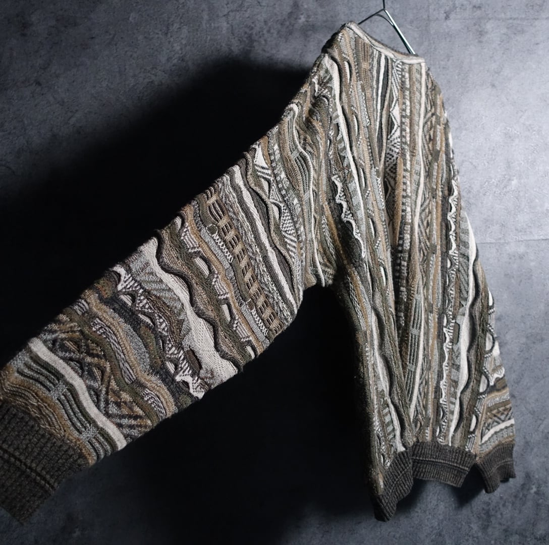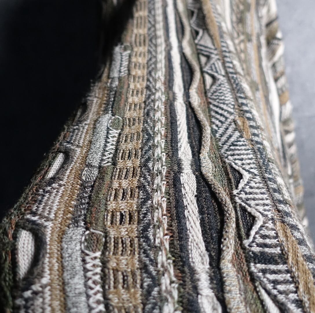 立体的な3Dのうねりのあるニッティングを全面にあしらい、さらに所々に幾何学模様をあしらったスペシャルなデザイン。