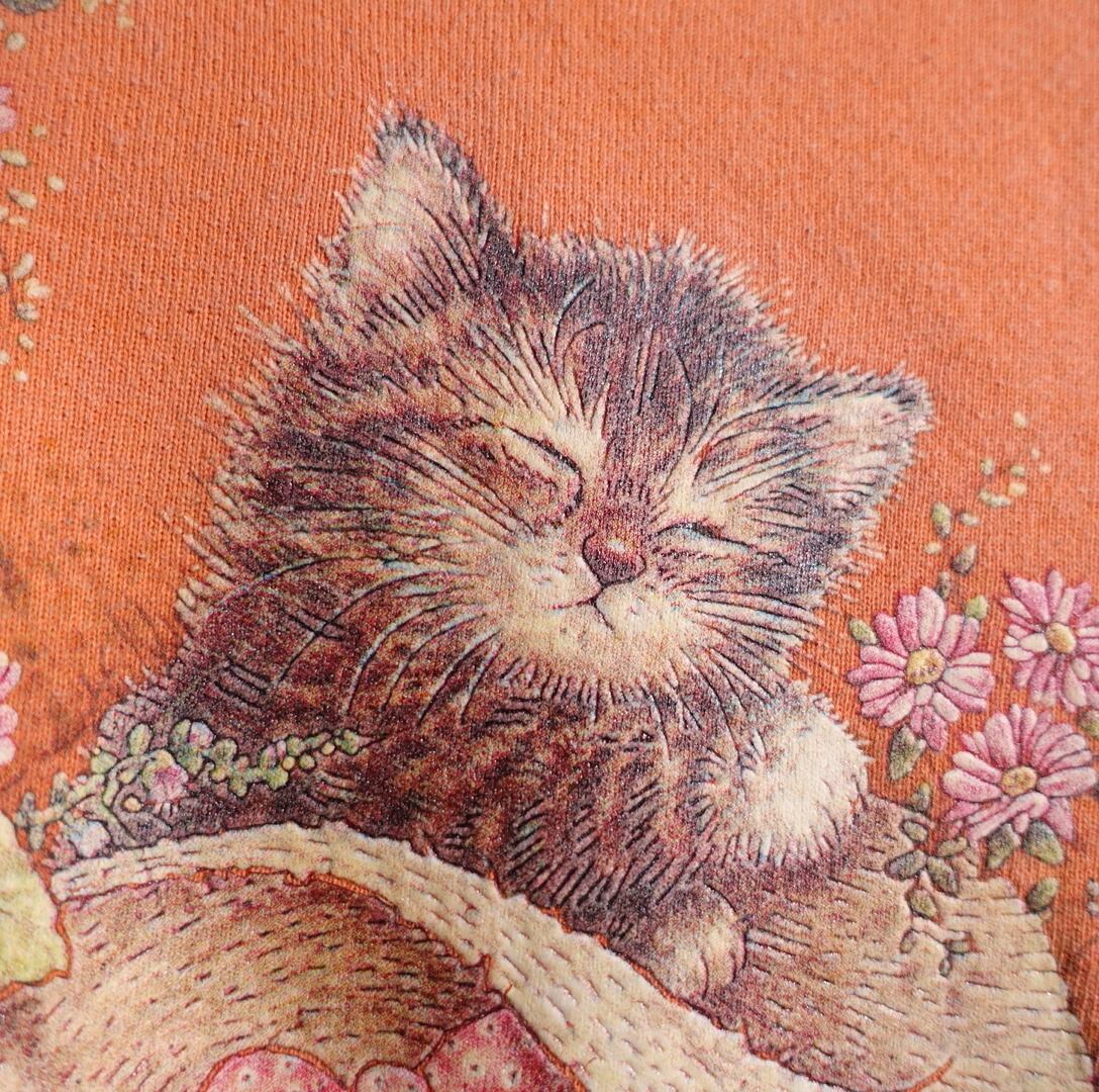 フロントに麦穂帽子の中で眠っている猫と花モチーフをあしらったグッドプリントデザイン。