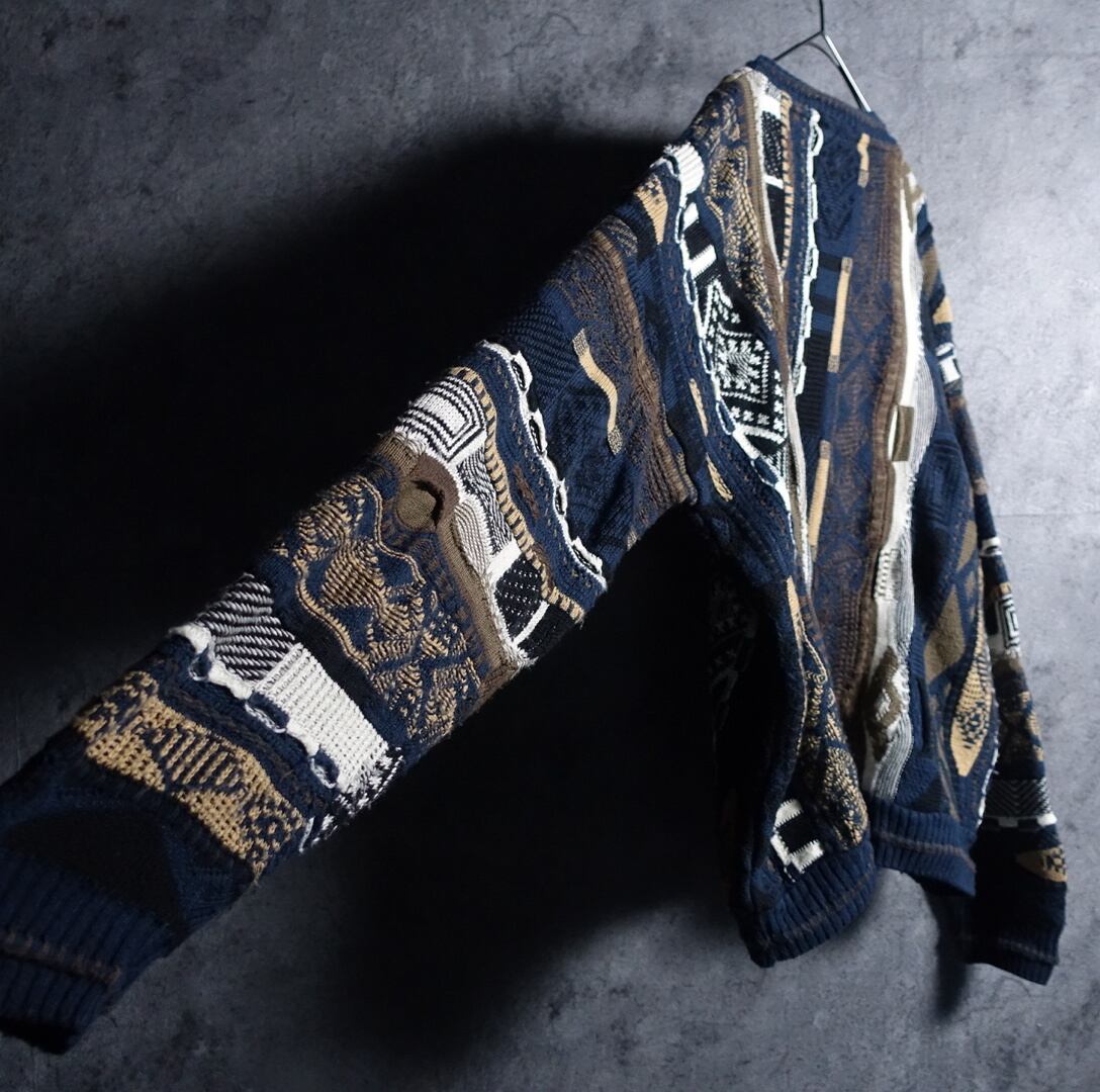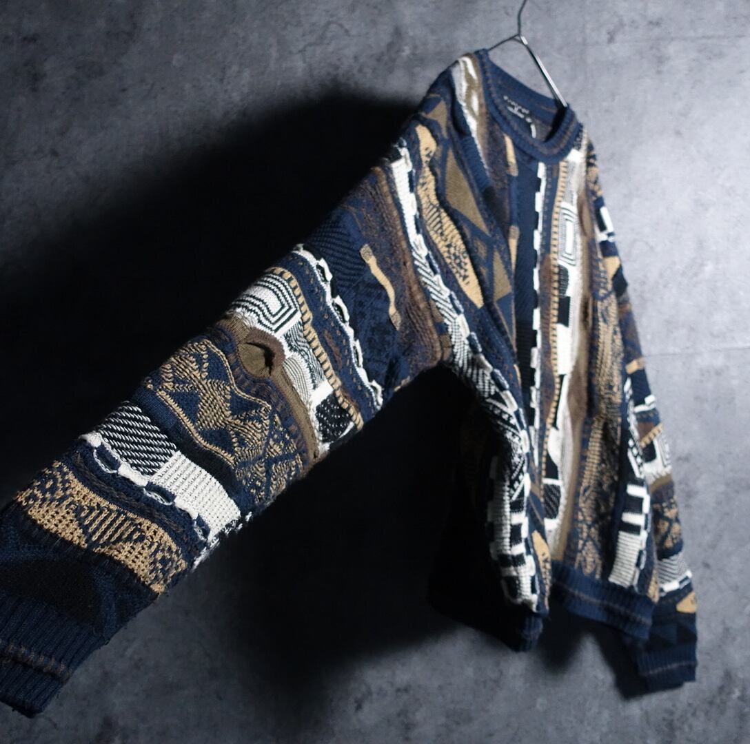 様々な種類の立体的な3Dのうねりのあるニッティングと幾何学模様を全面にあしらったスペシャルなデザイン。