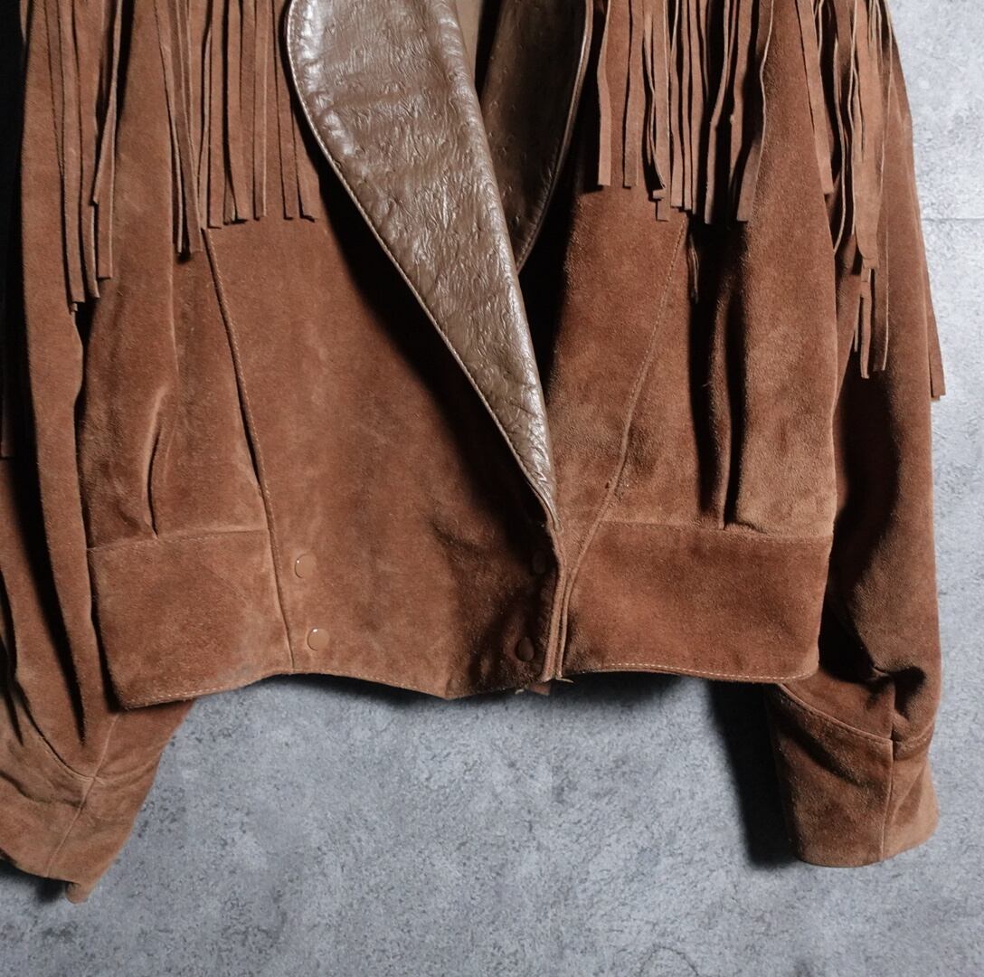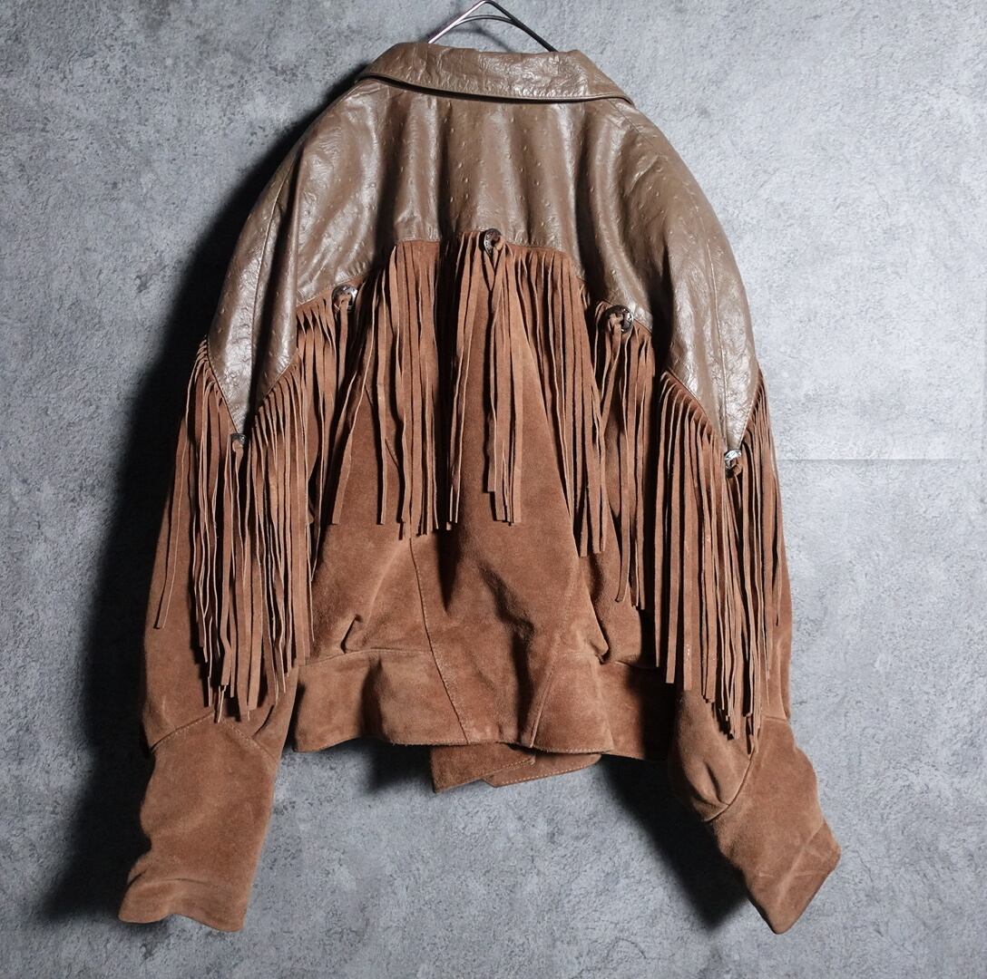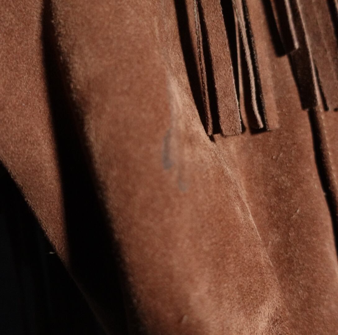 ブラウンのリアルスエードをベースに肩周りとラペル部分をリアルレザーに切替し、前後の見頃から袖にかけて全体にフリンジを施したスペシャルなデザイン。