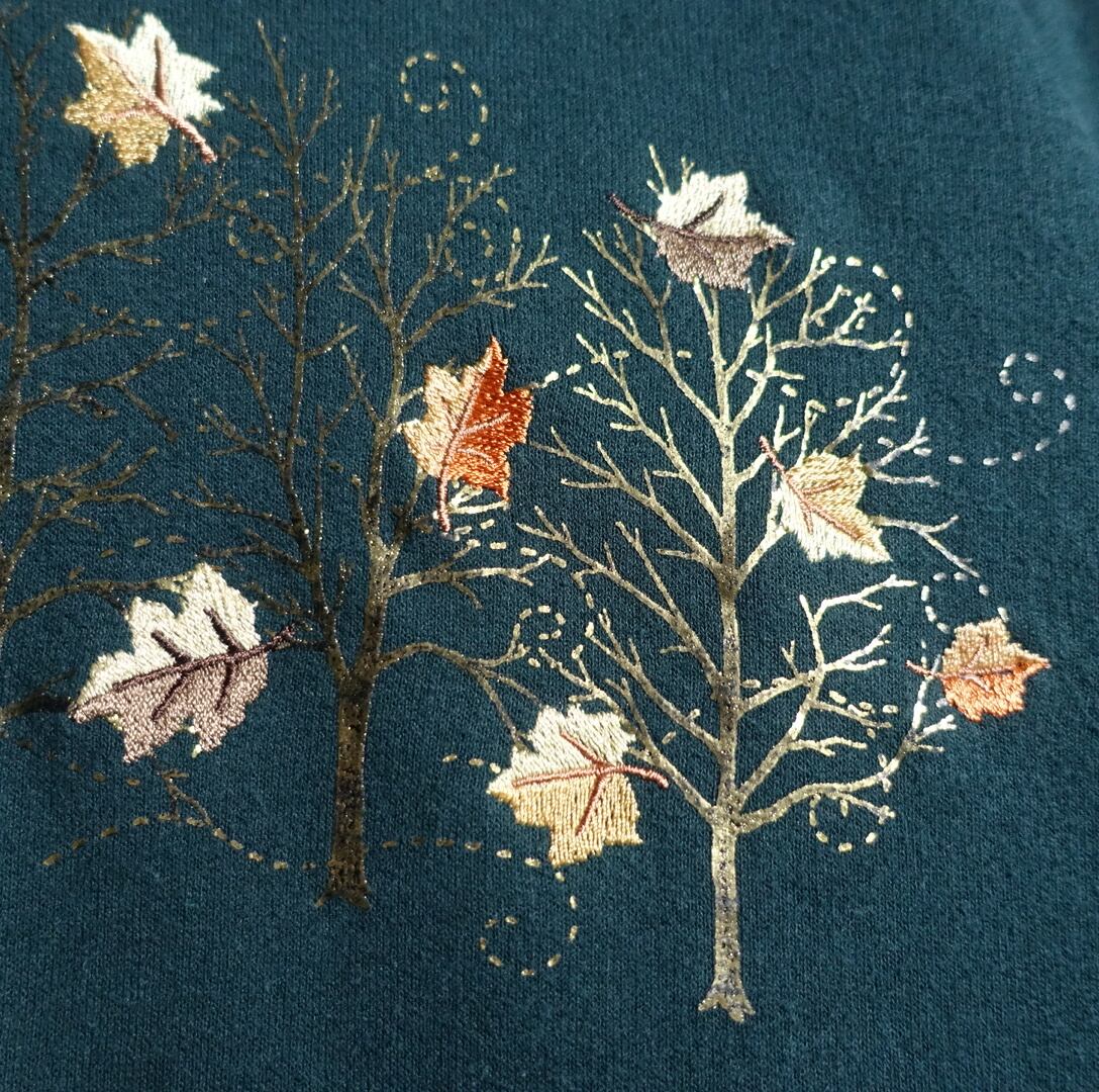 フロントに木と紅葉をプリントと刺繍で表現したグッドデザイン。