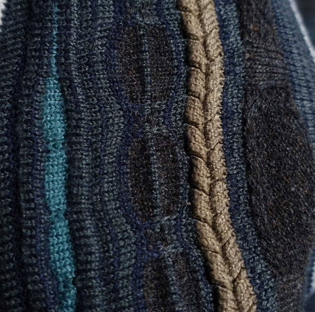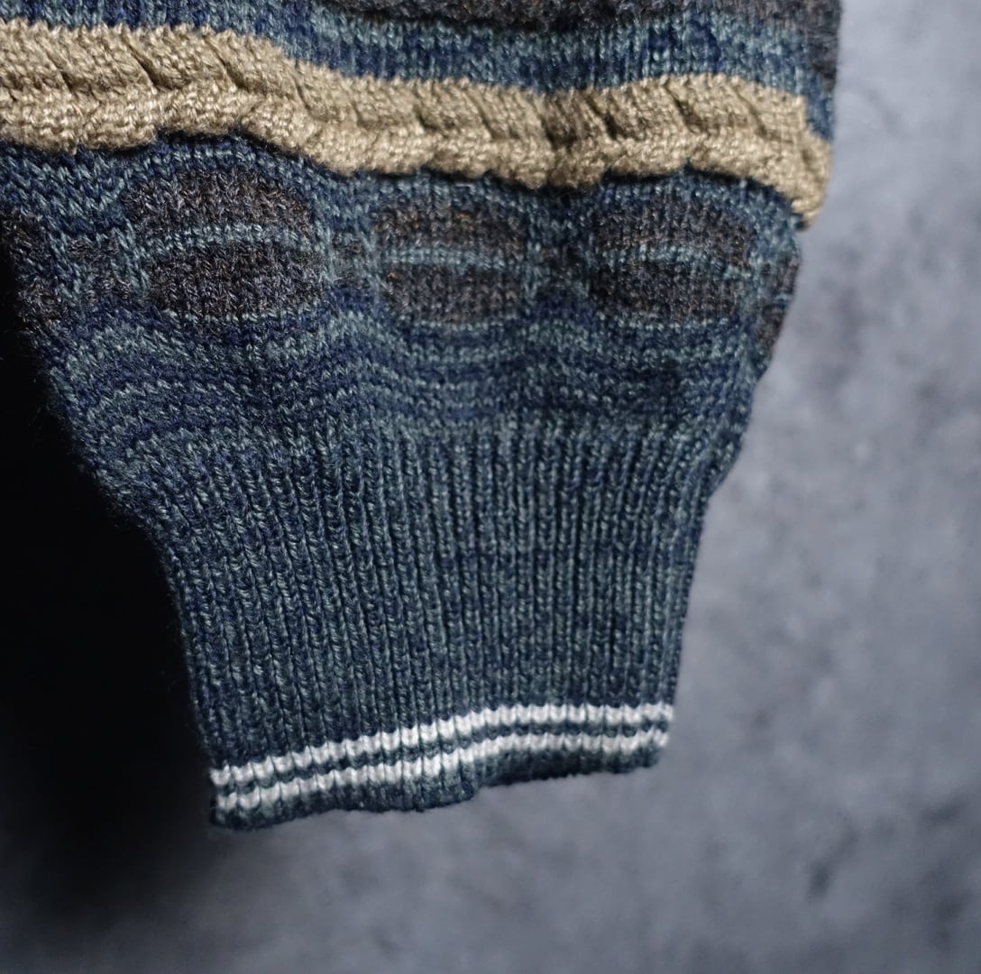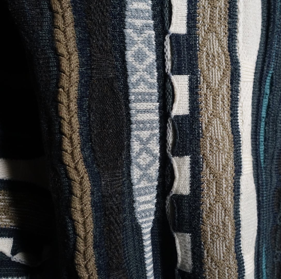 立体的な3Dのうねりのあるニッティングを全面にあしらい、さらに所々に幾何学模様や抽象的な柄をあしらったスペシャルなデザイン。