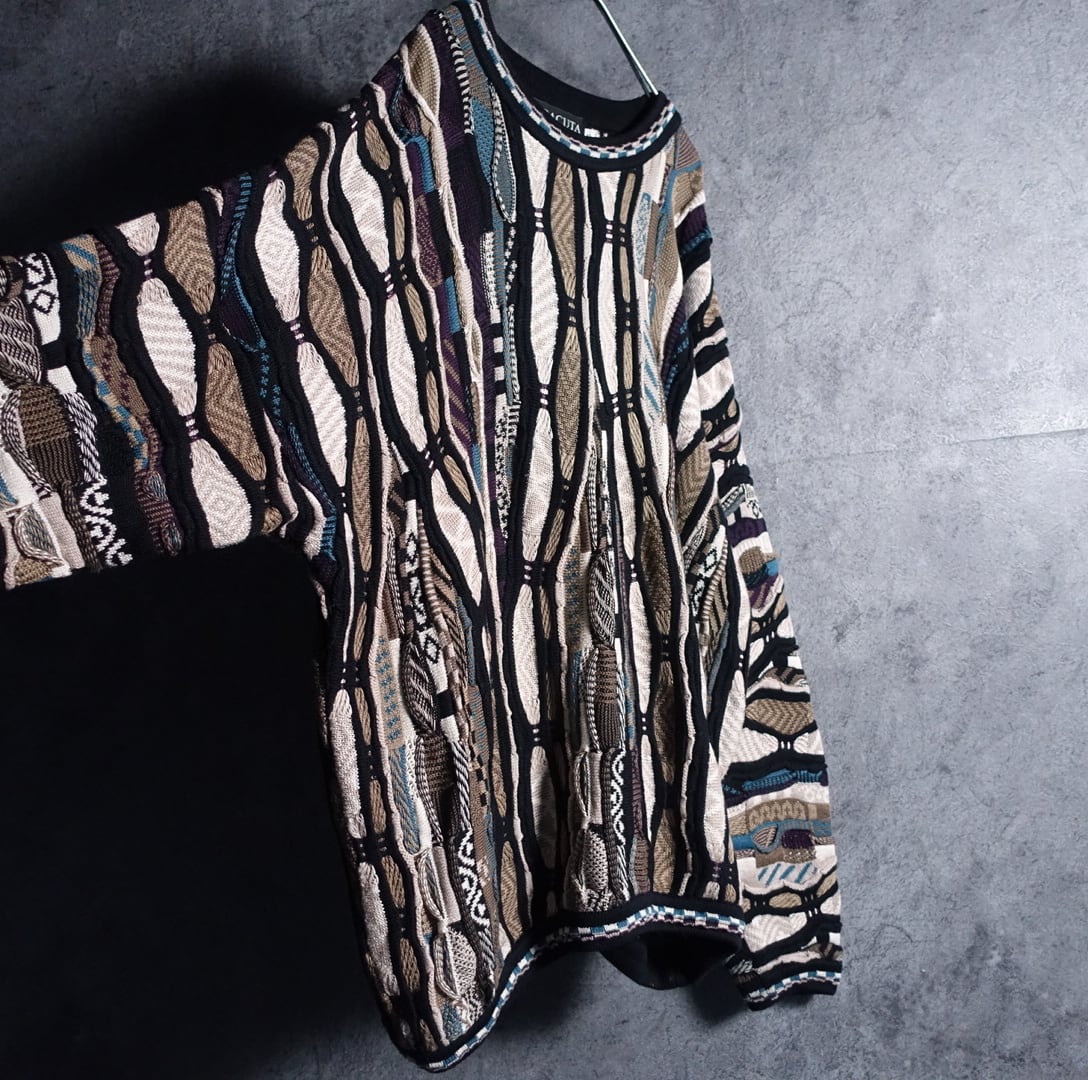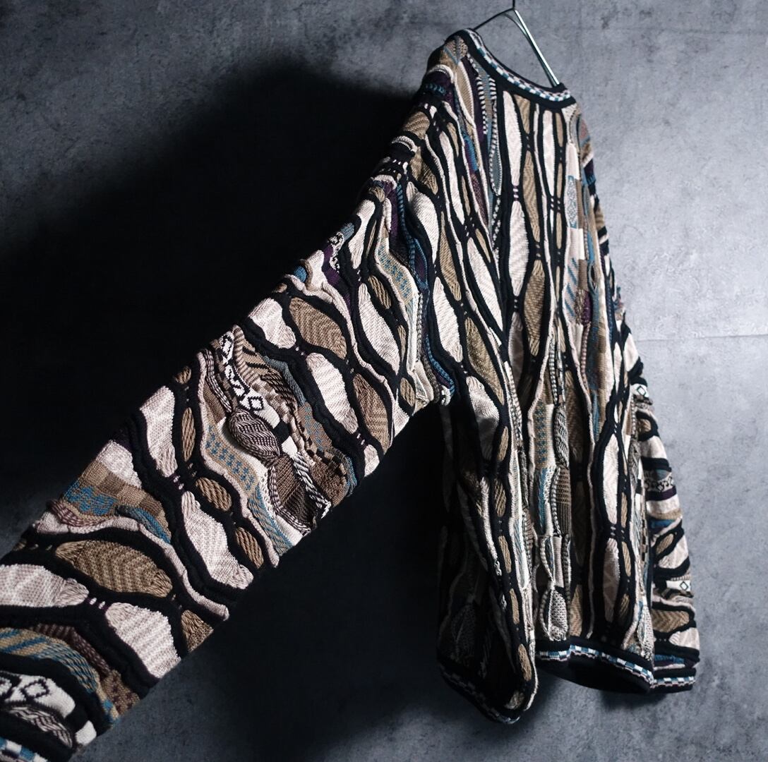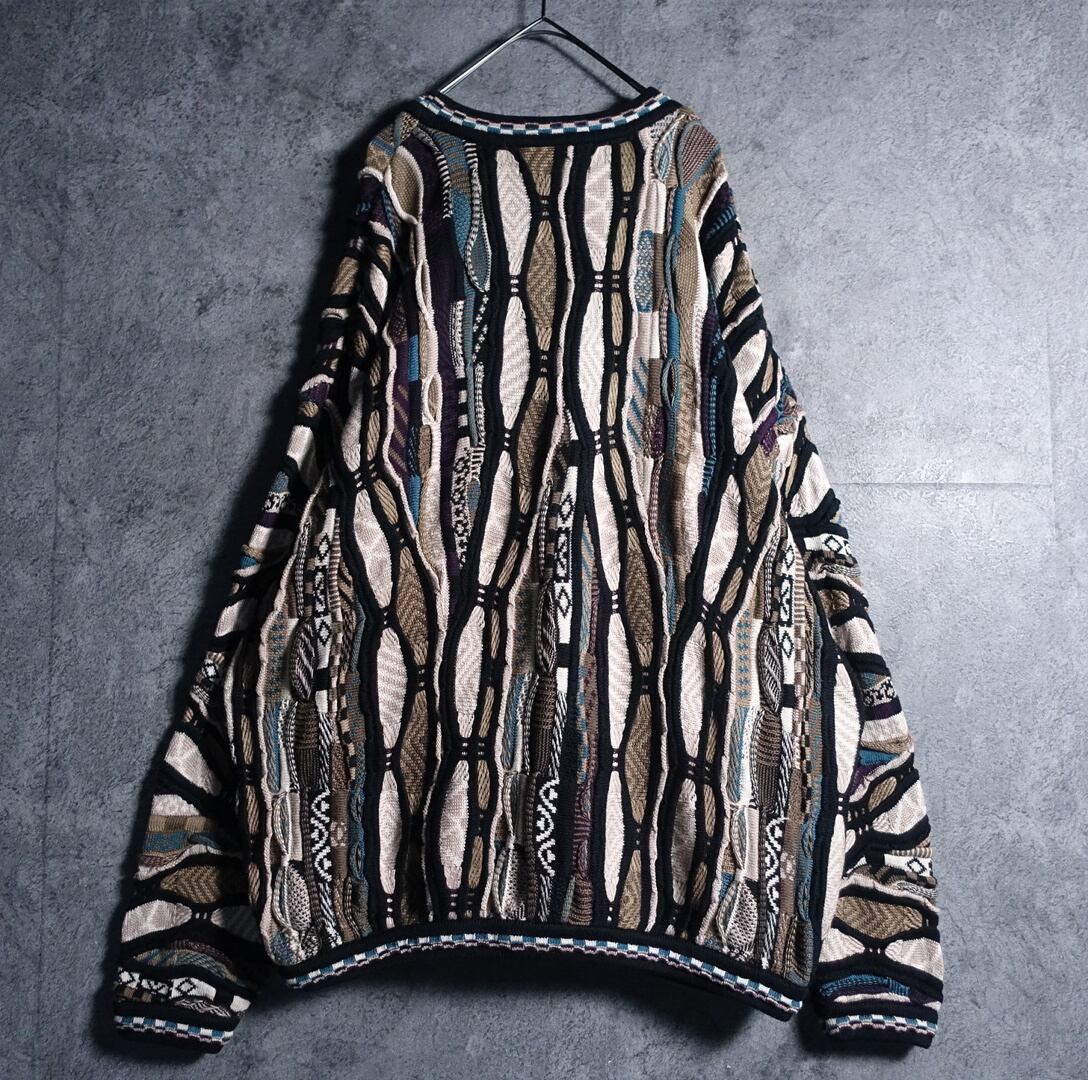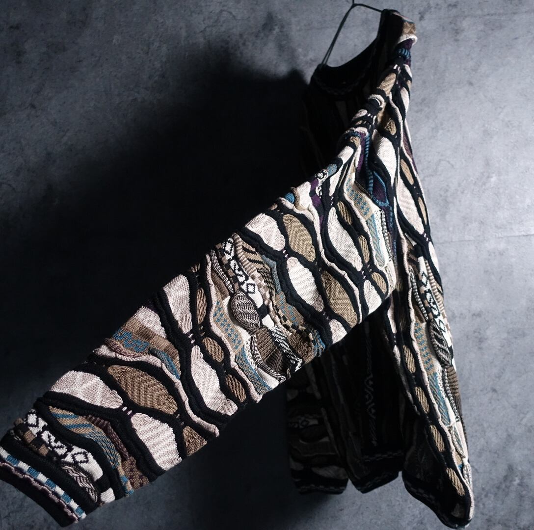 様々な種類の立体的な3Dのうねりのあるニッティングと幾何学模様を全面にあしらったスペシャルなデザイン。
