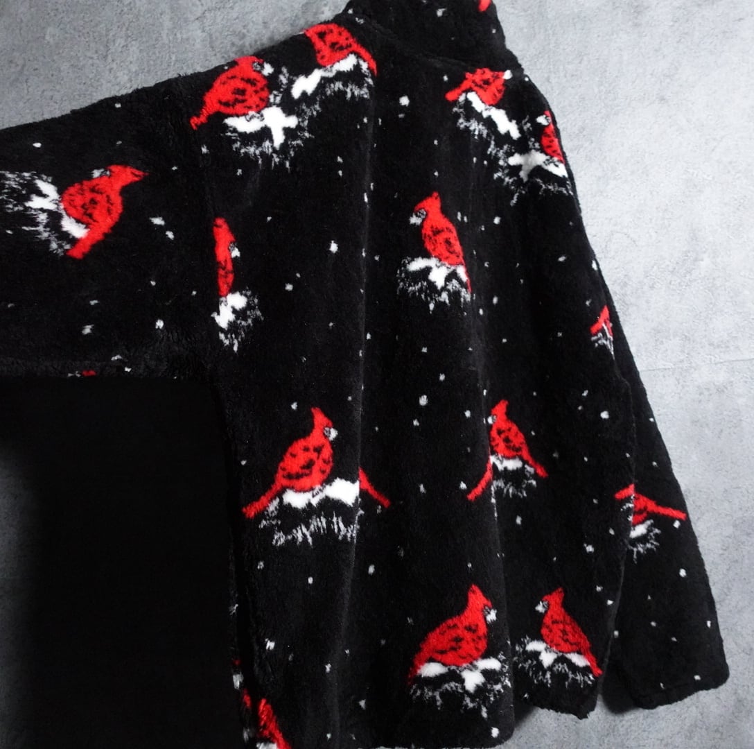 ブラックをベースにレッドの鳥モチーフと雪を全面にあしらった冬らしいデザイン。