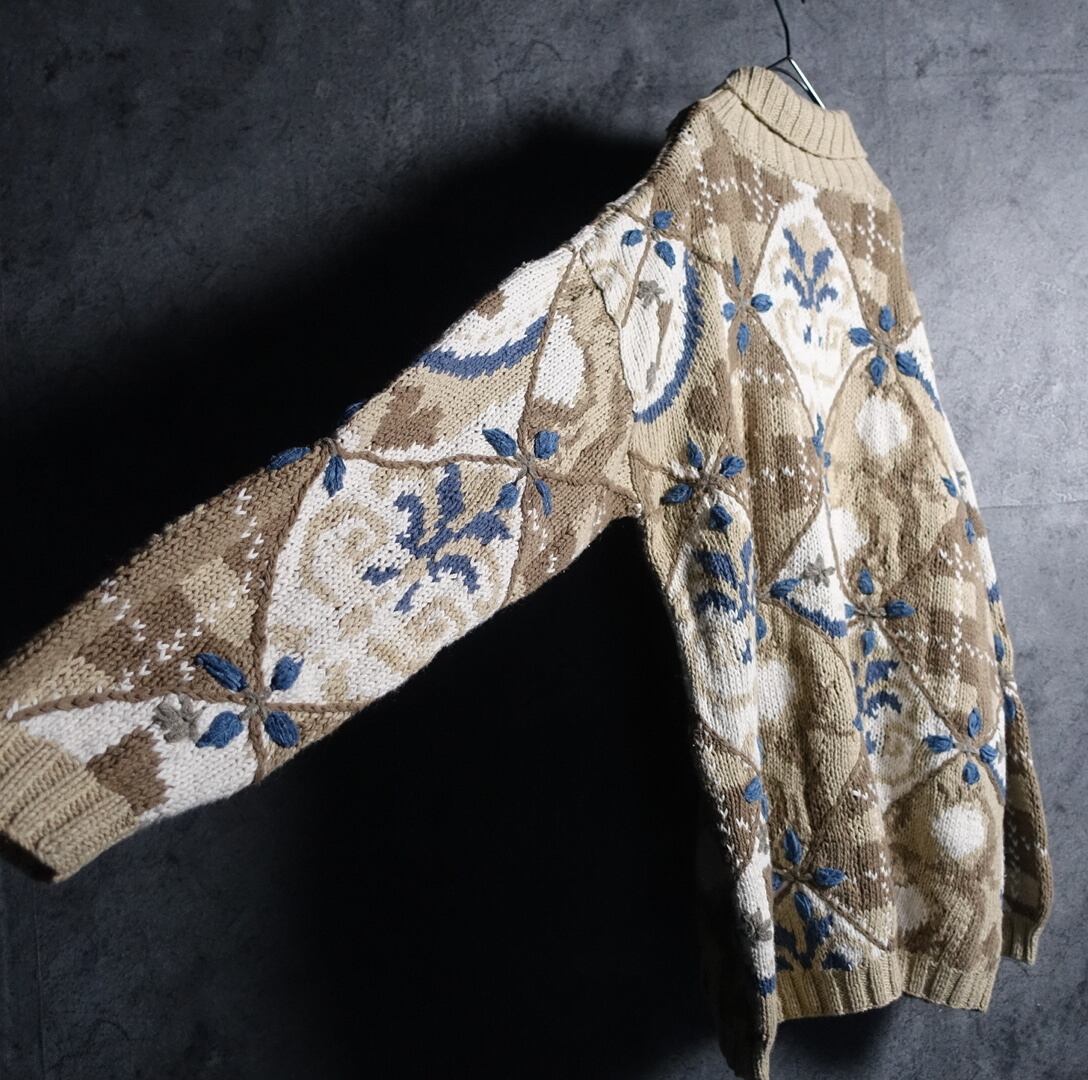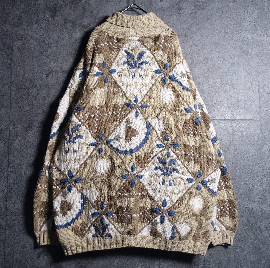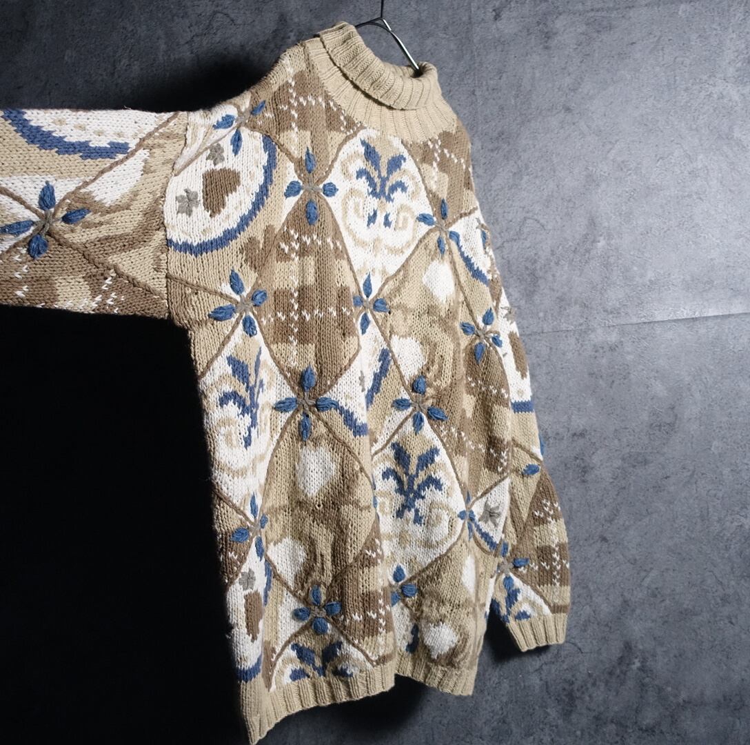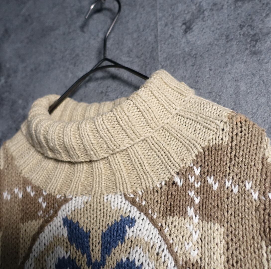 90s “EXPRESS TRICOT” Multicolor Pattern Design Turtleneck Hand Knit