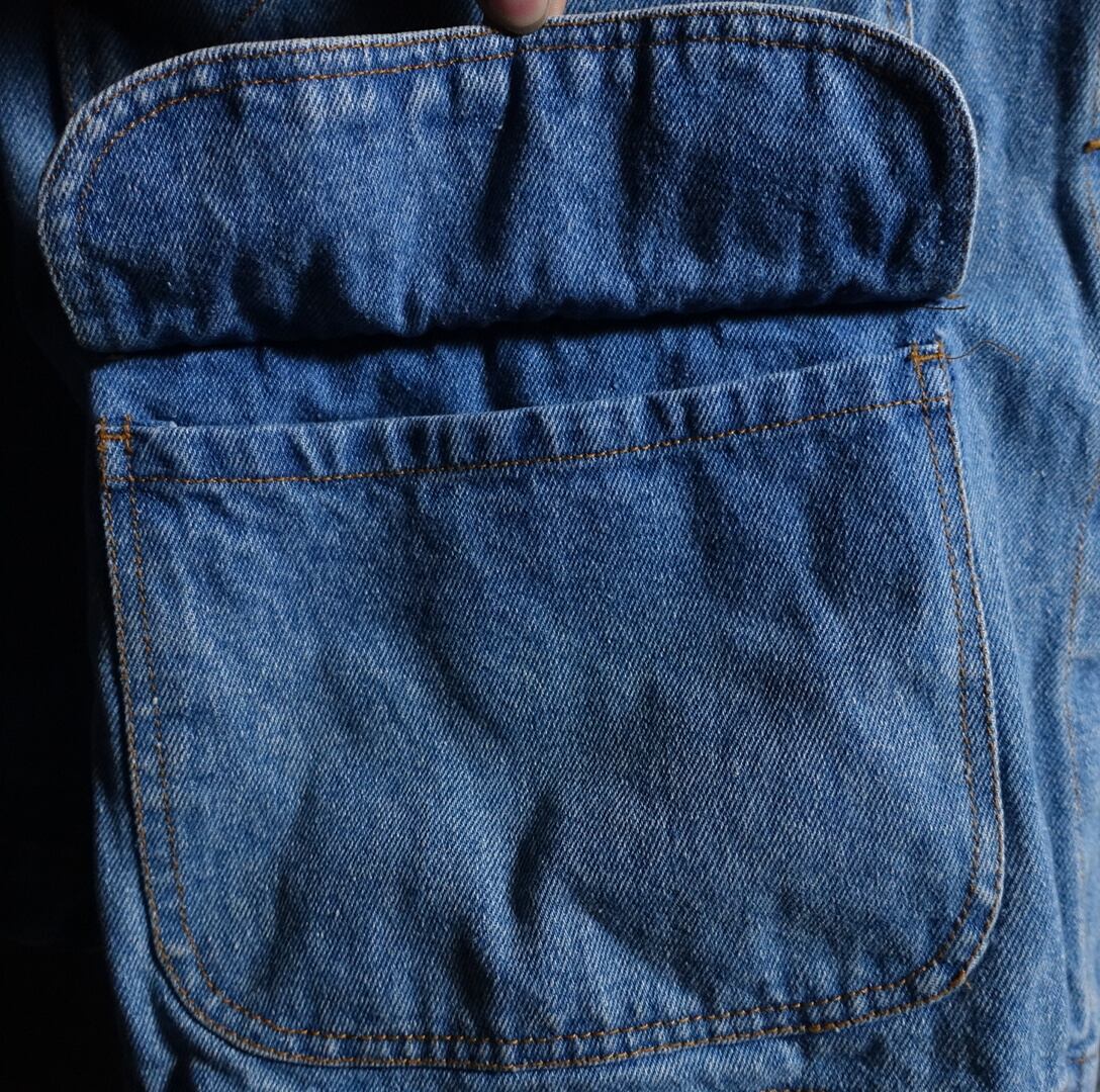 デニムをベースに前面に4つの大きなポケットを施した昨今人気の高いカバーオールタイプ。