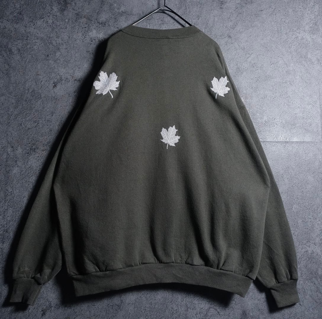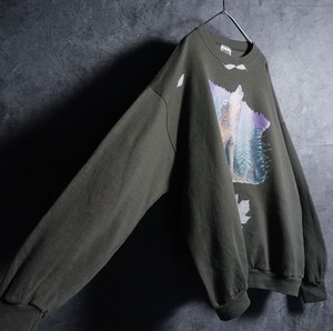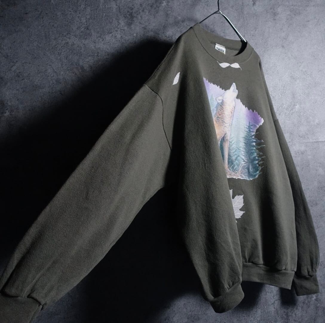 90s “TULTEX” Khaki Wolf & Fallen Leaves Print Sweat