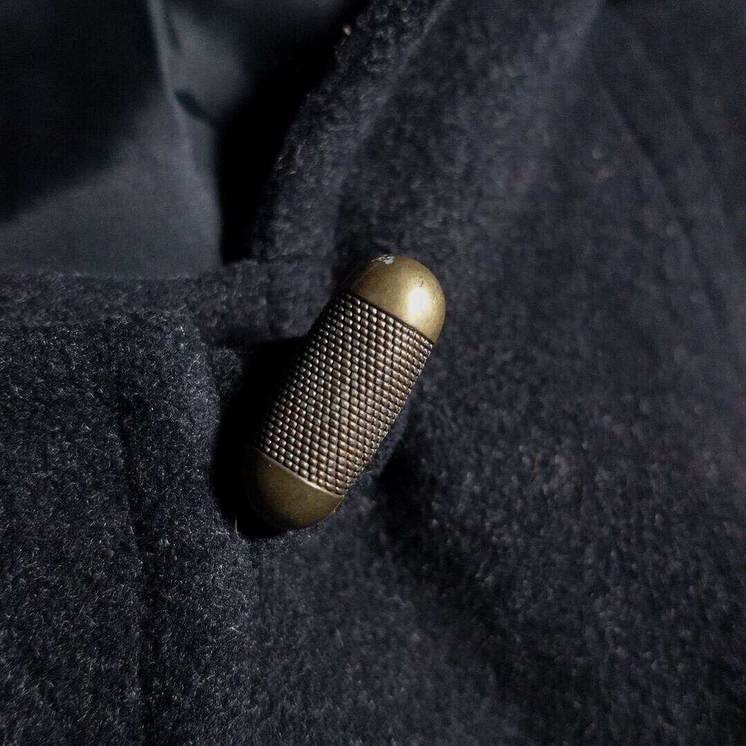 ボタンが存在感のある燻んだゴールドのデザインボタンになっており、留め方を特徴的で洒落ています。