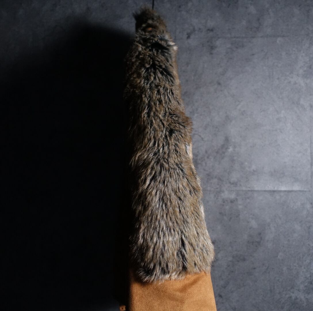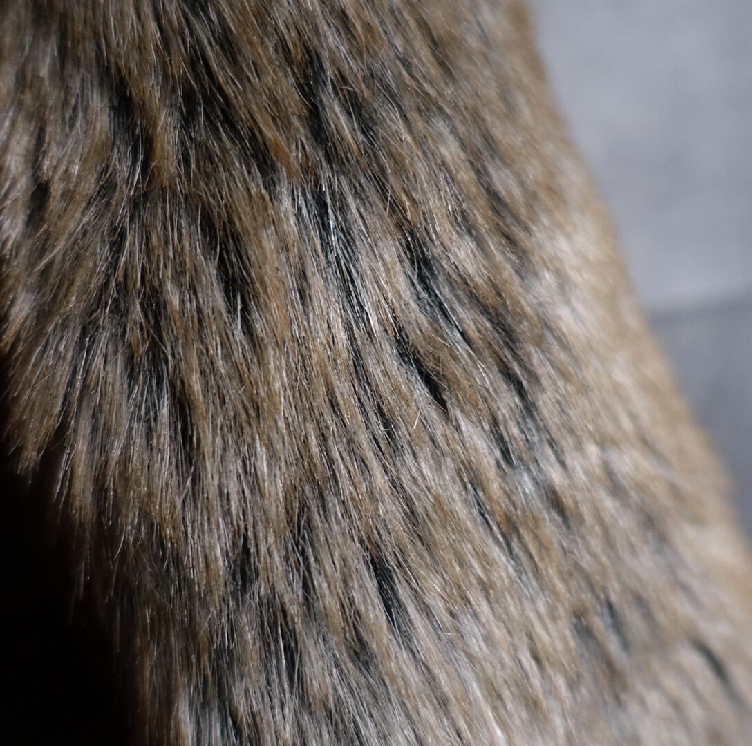 襟、袖、フロントに毛足の長いフェイクファーを施したラグジュアリーなデザイン。