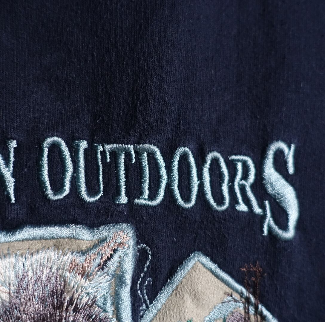 フロントにウルフのモチーフ、風景、アルファベットを刺繍で施したグッドデザイン。