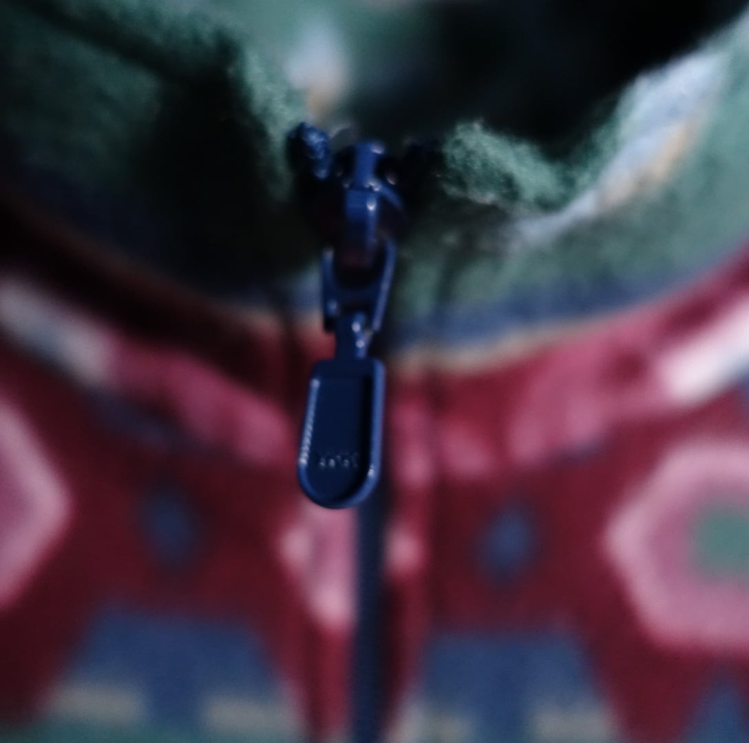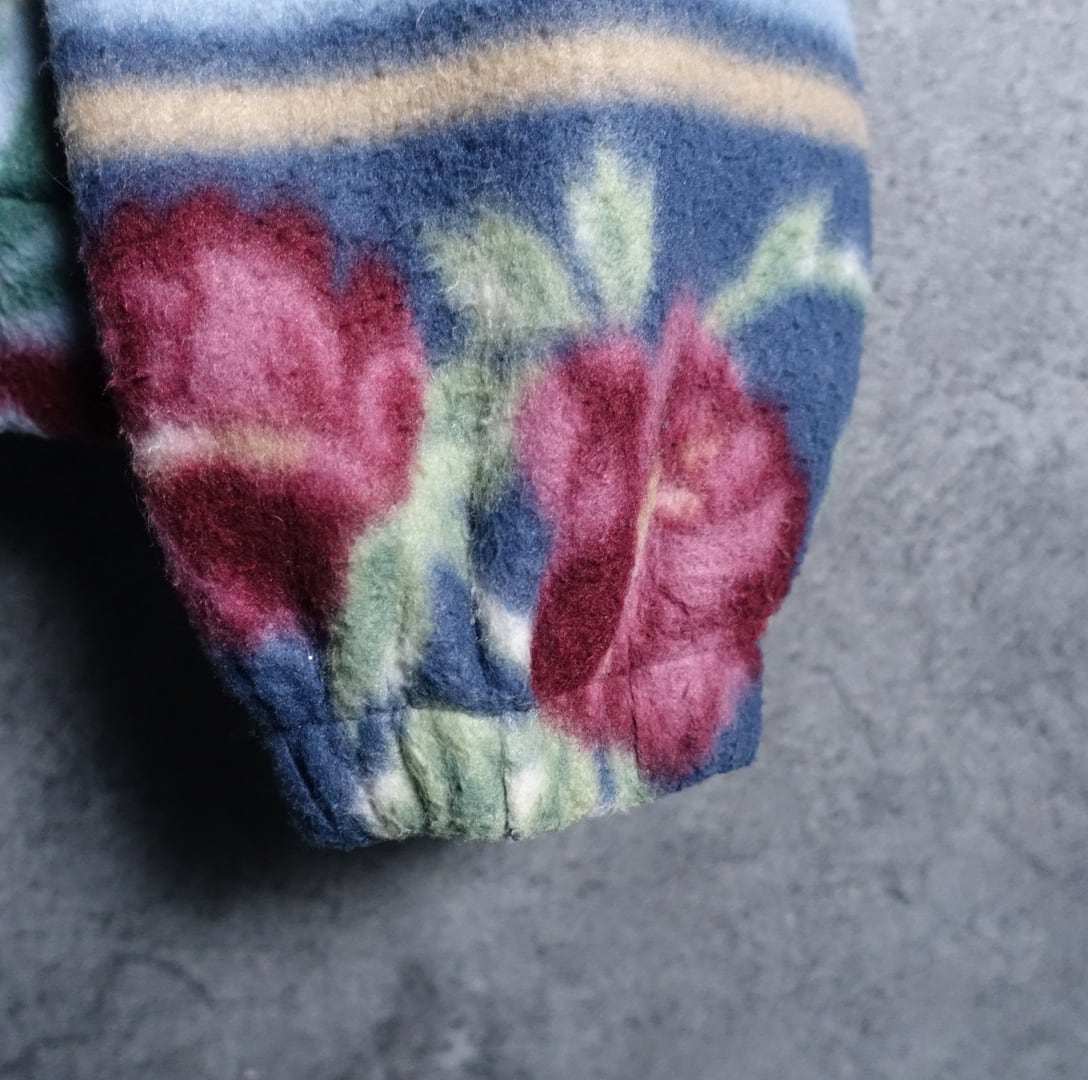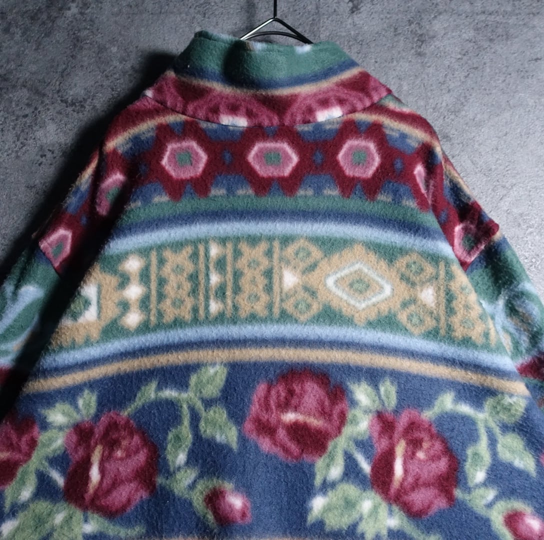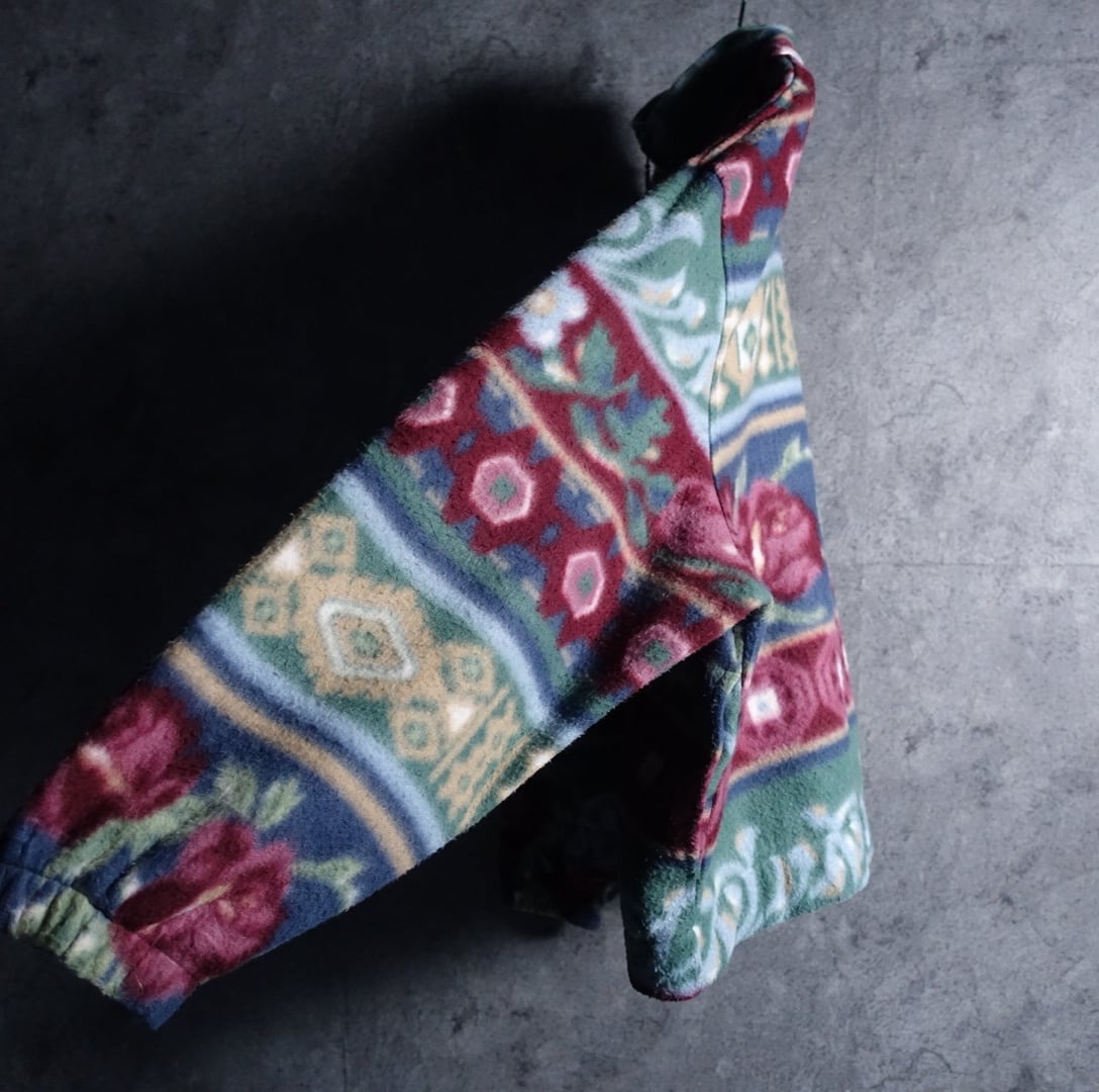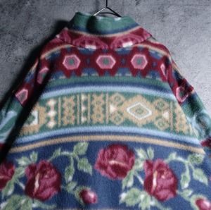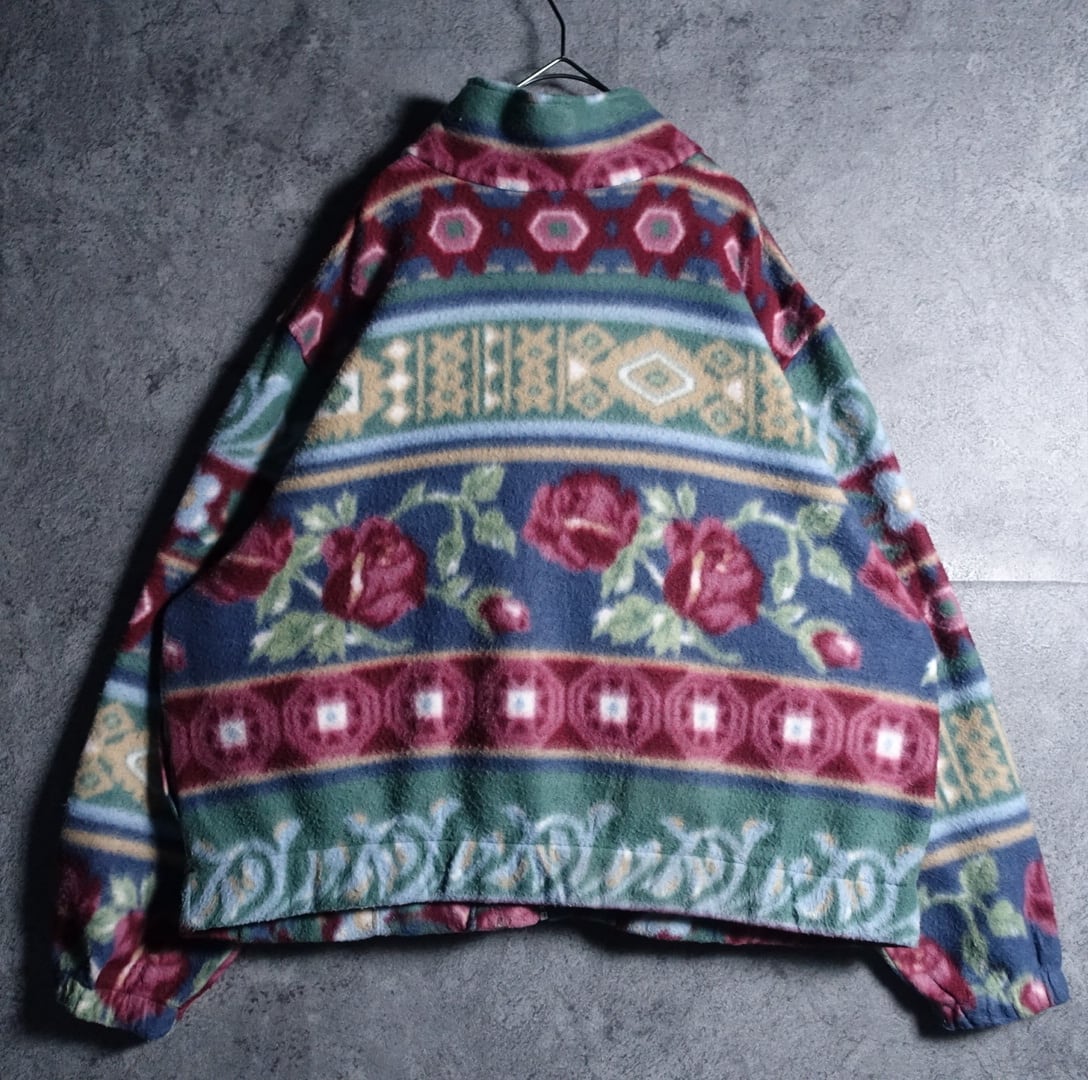バラ、幾何学模様をボーダー状に全面にあしらったフリースでは珍しいアーティスティックなデザイン。