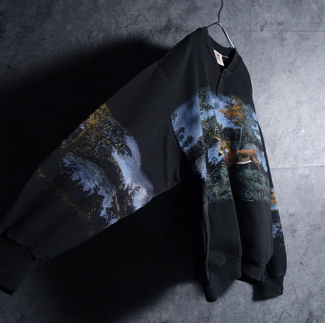 90s “ART UNLIMITED” Black Deer Landscape Print All Over Design Sweat