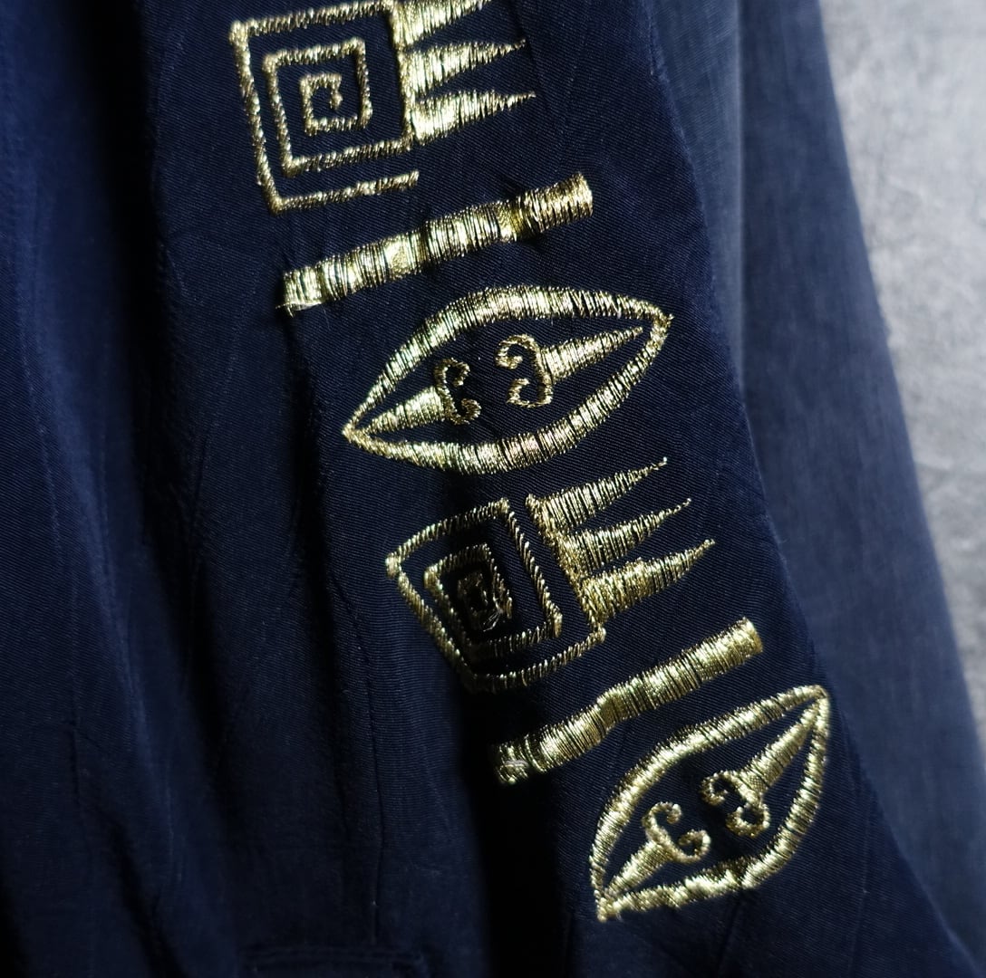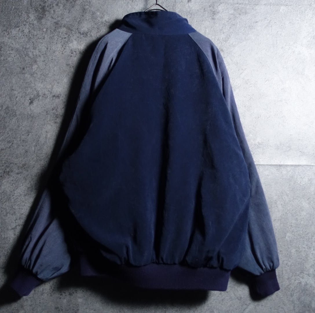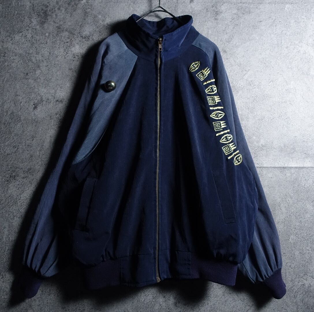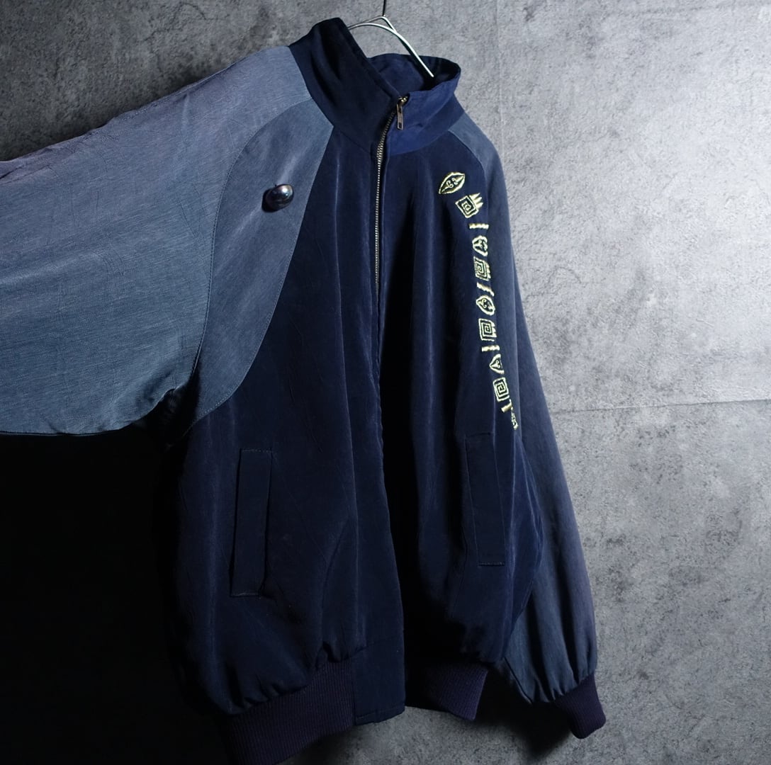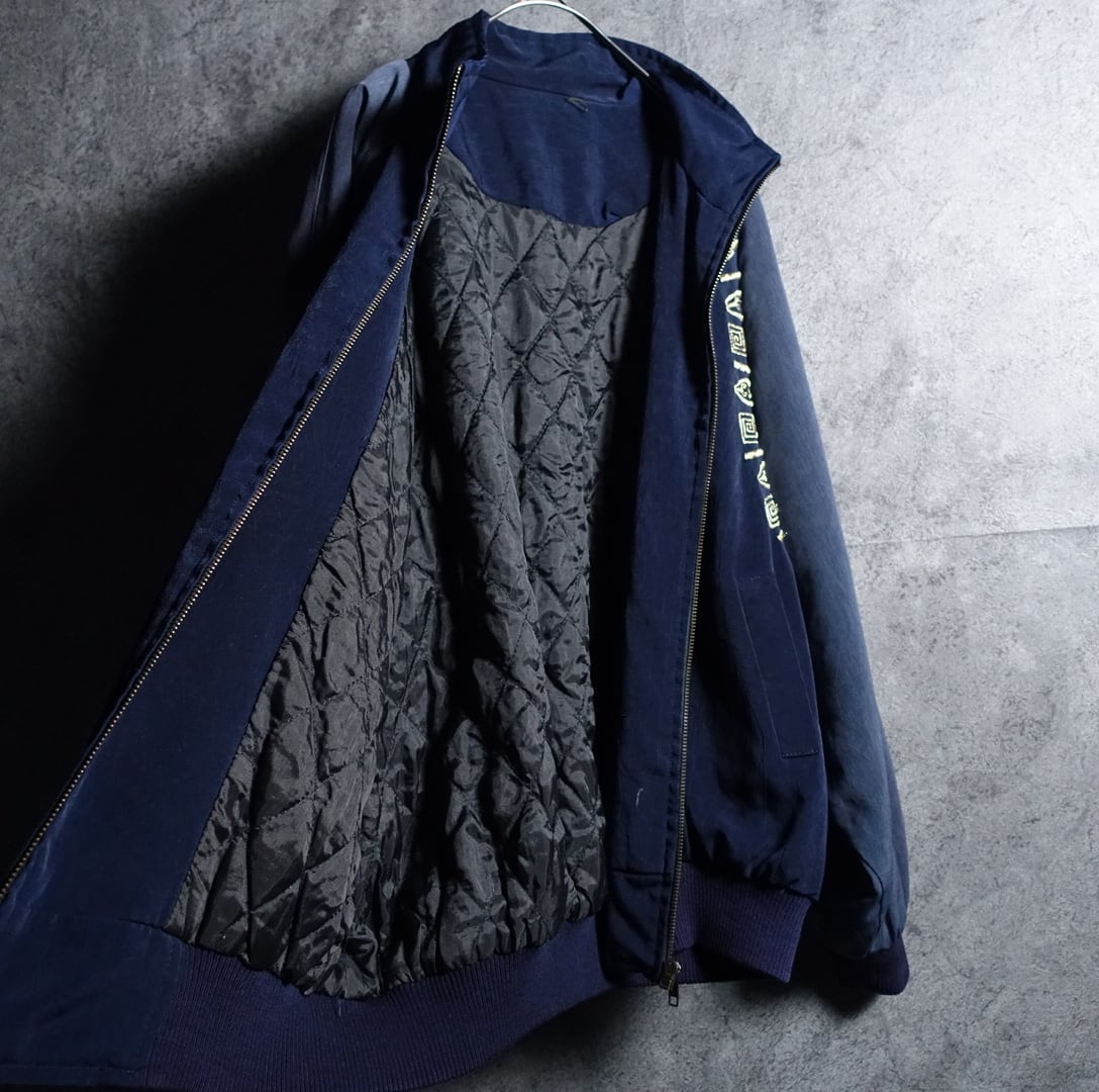 Blue Motif Embroidery Design Quilting Nylon Zip Blouson