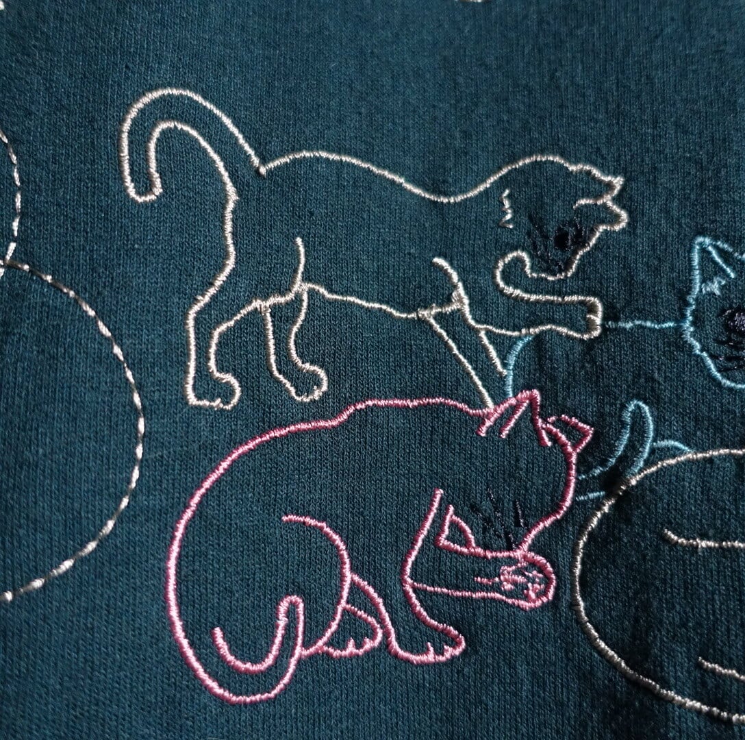 周りの囲いが毛糸になっていることや、ネコ達が戯れる様子まで表現されておりハイクオリティーな刺繍デザインとなっています。