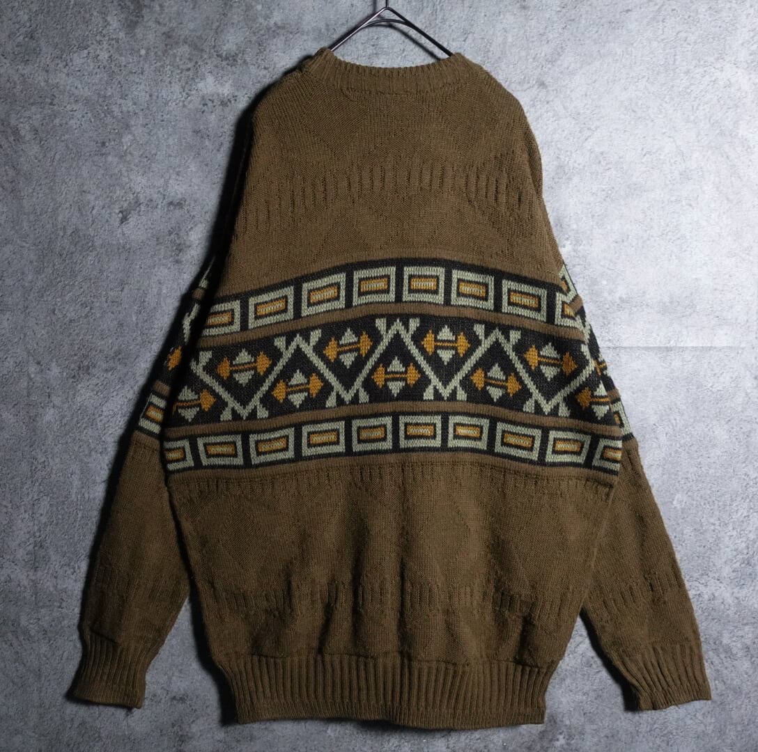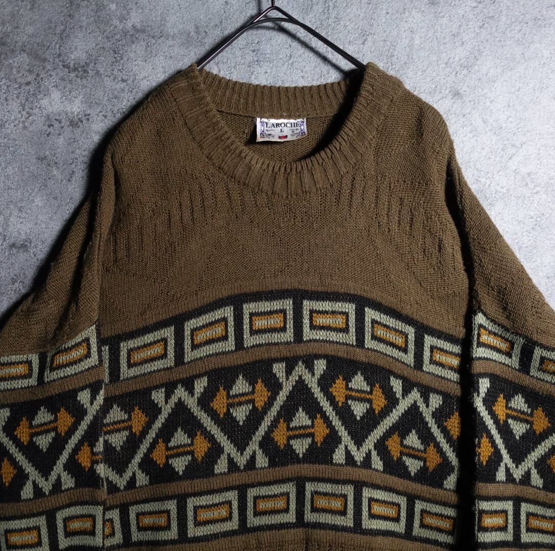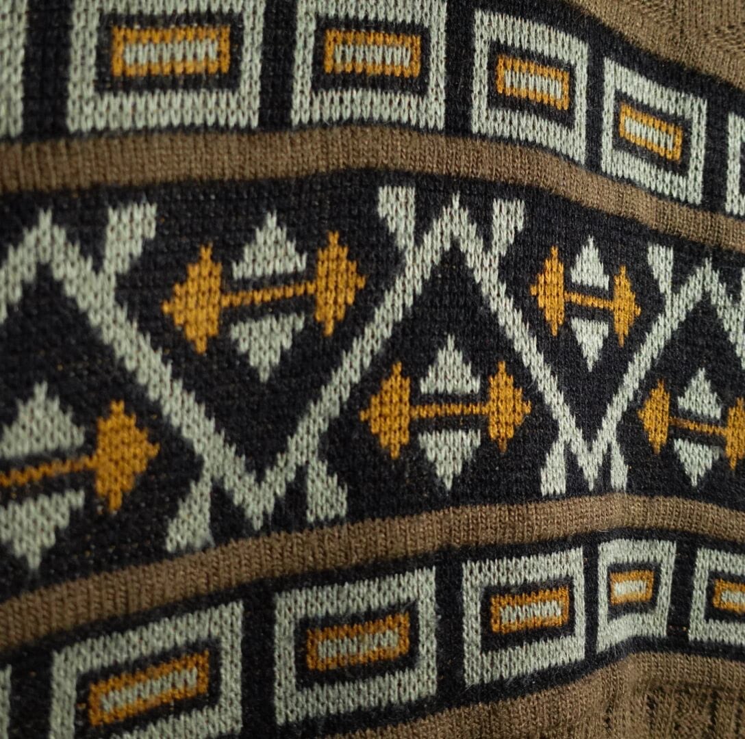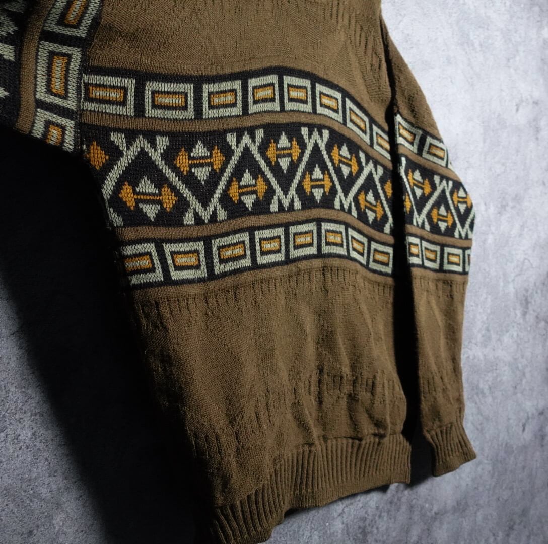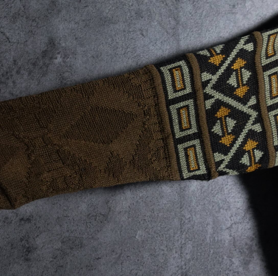 カーキをベースにイエロー、ベージュ、ブラックの幾何学模様と、ダイヤモチーフをボーダー状に全面にあしらったデザイン。