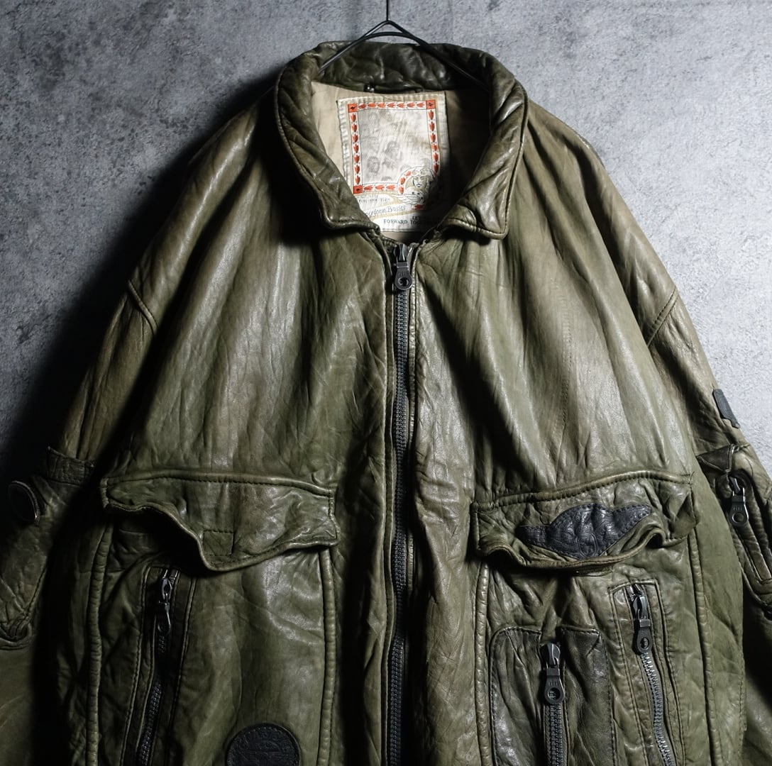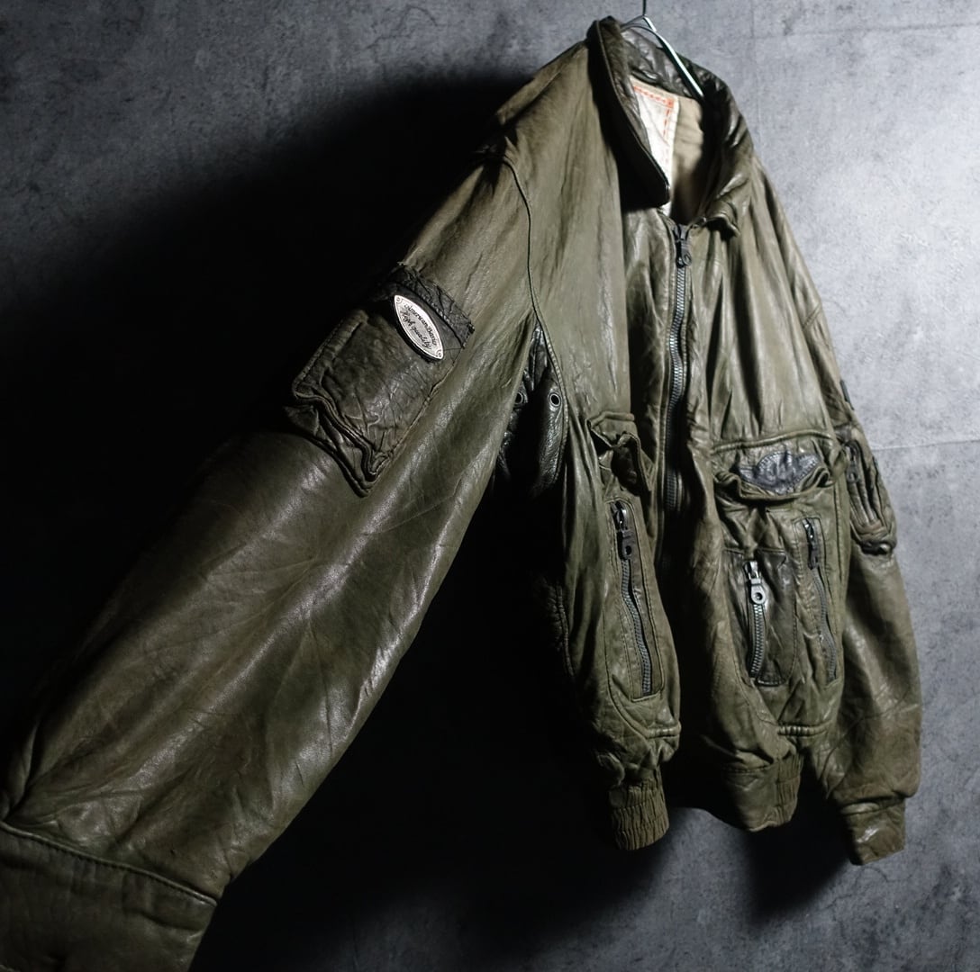 80-90s EURO Khaki Multi-Pocket Design Flight Leather Jacket