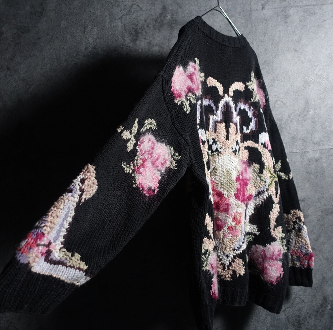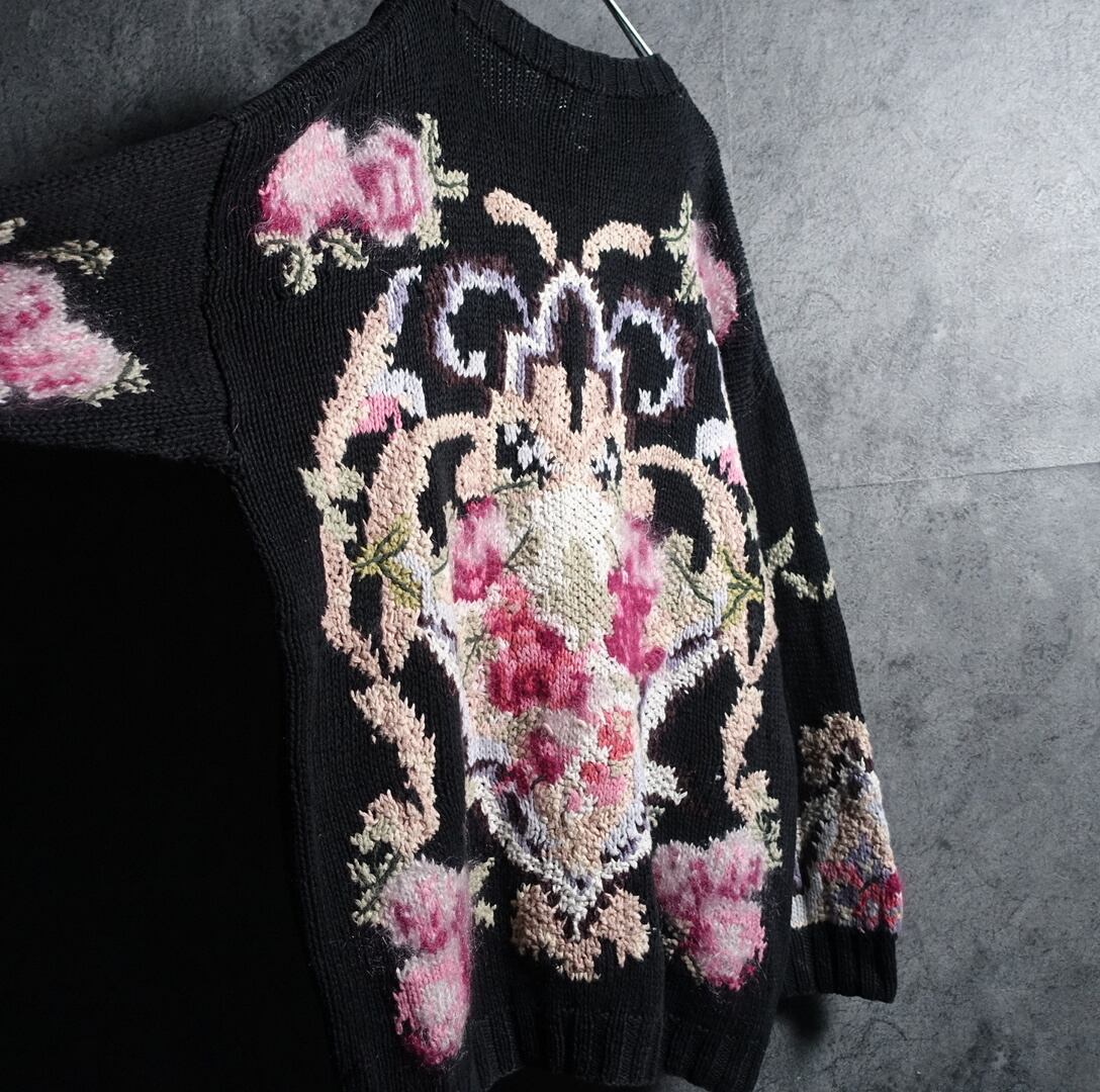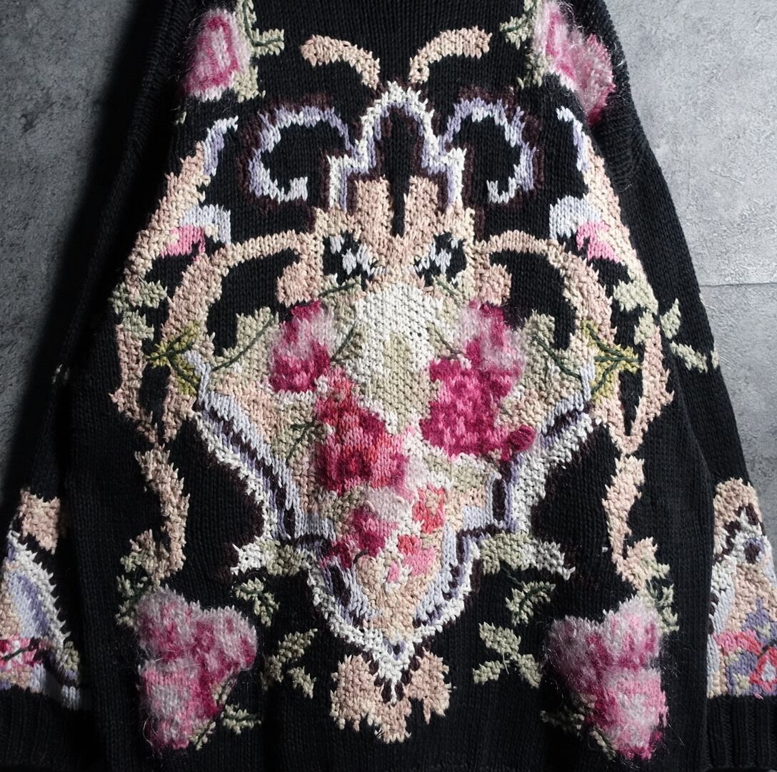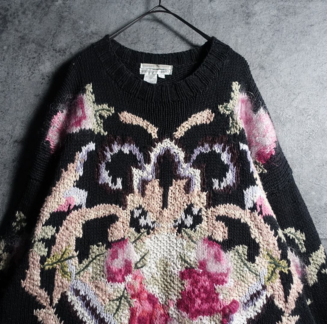 Black Flower Motif Design Ramie Cotton Hand Knit