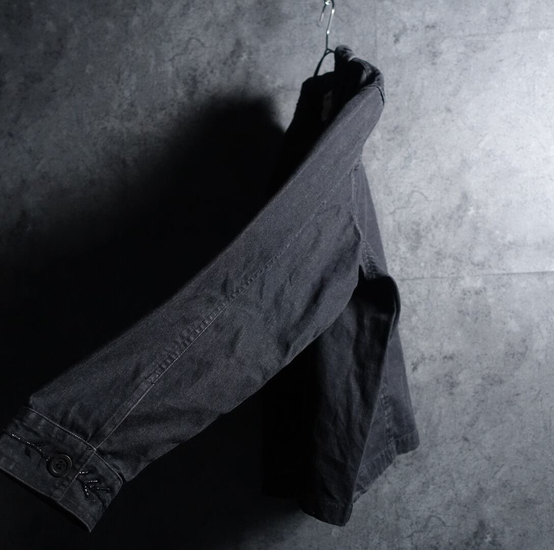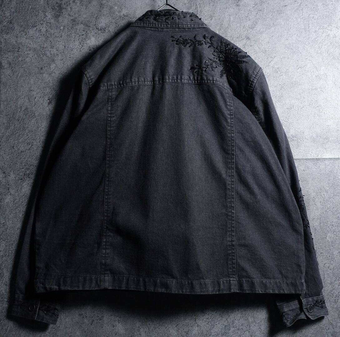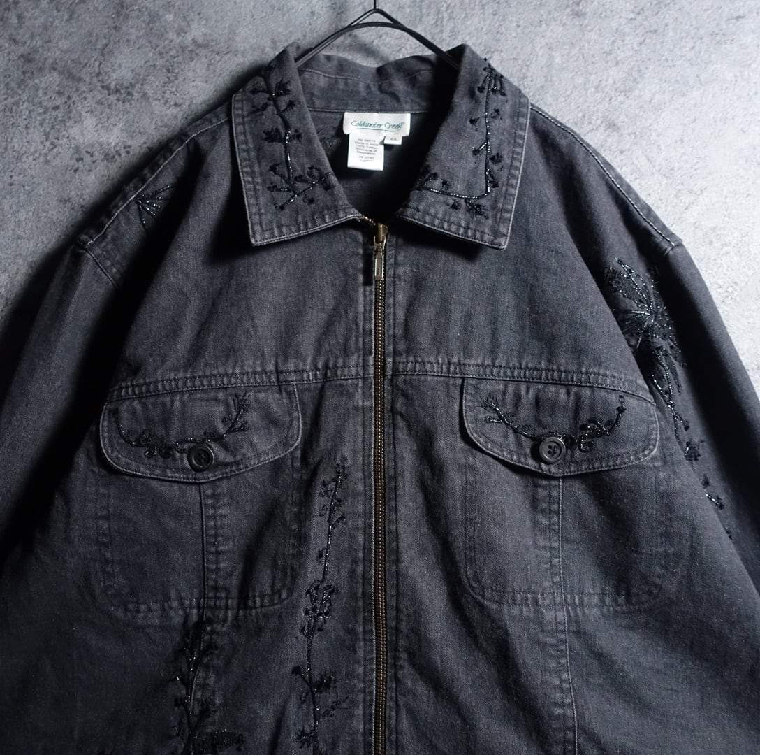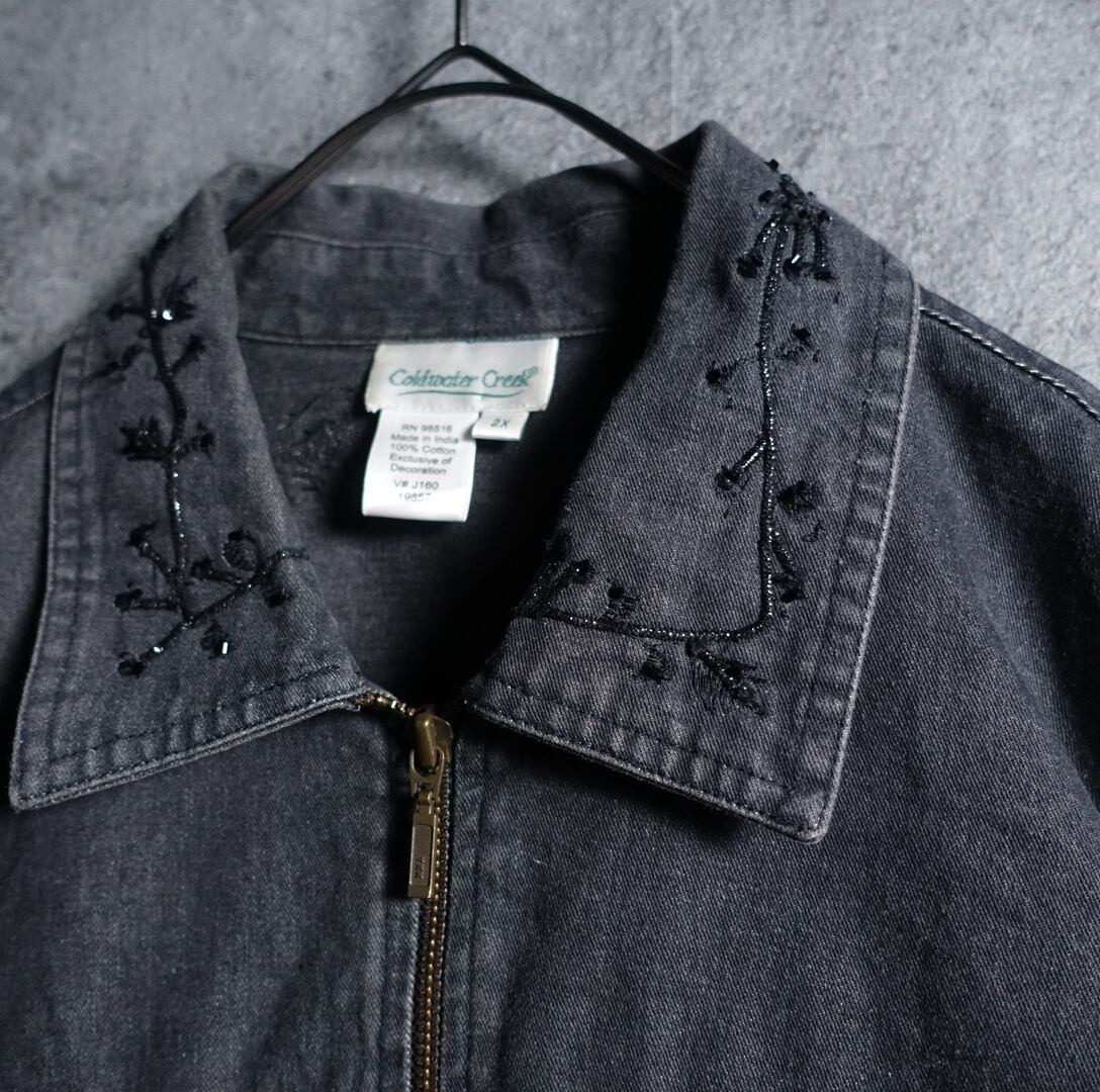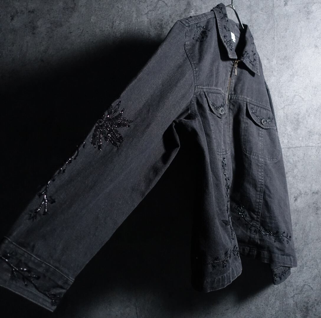 Black Flower Motif Embroidery Lame Design Short Length Denim Zip Jacket