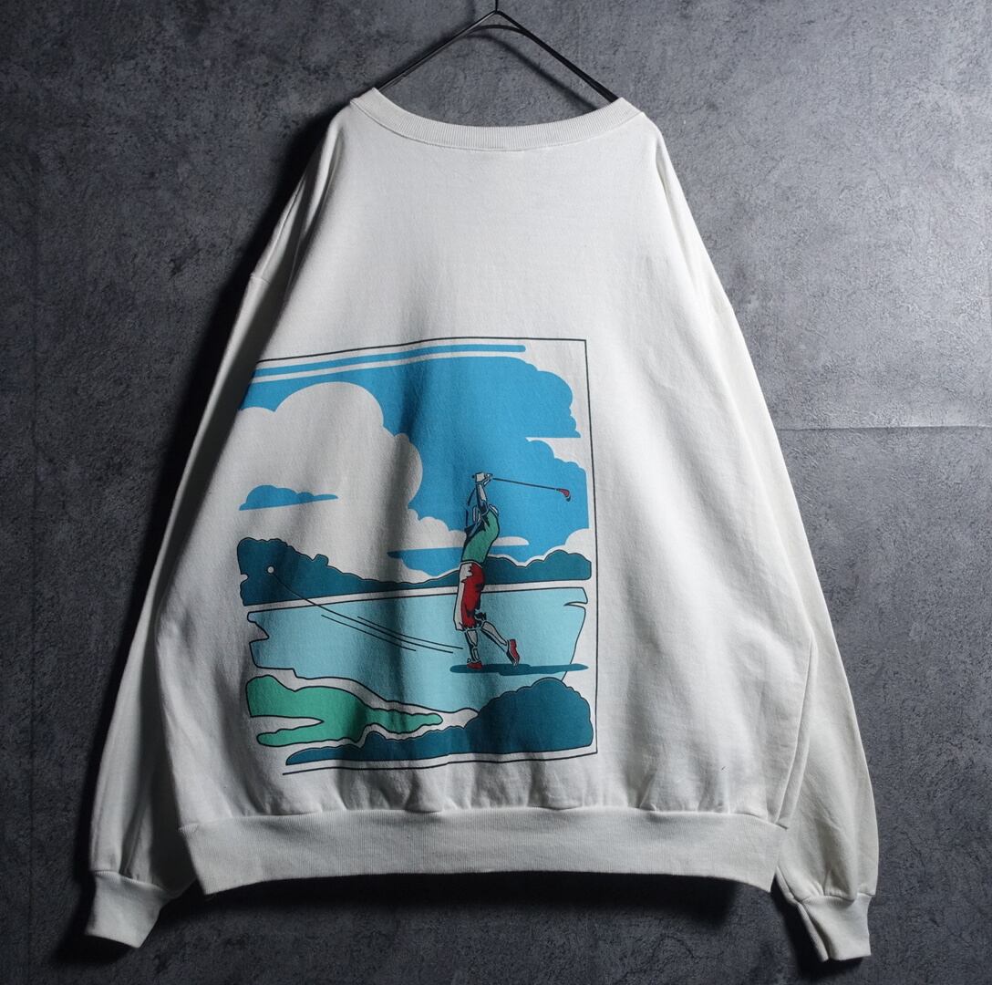 90s "HEAD" White Golf Fur Landscape Print Design Sweat
