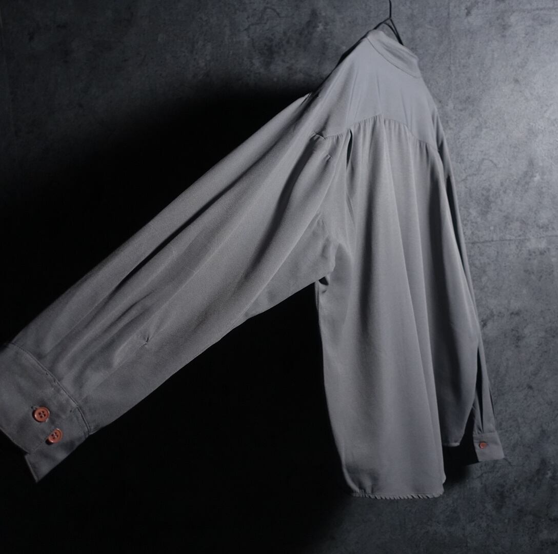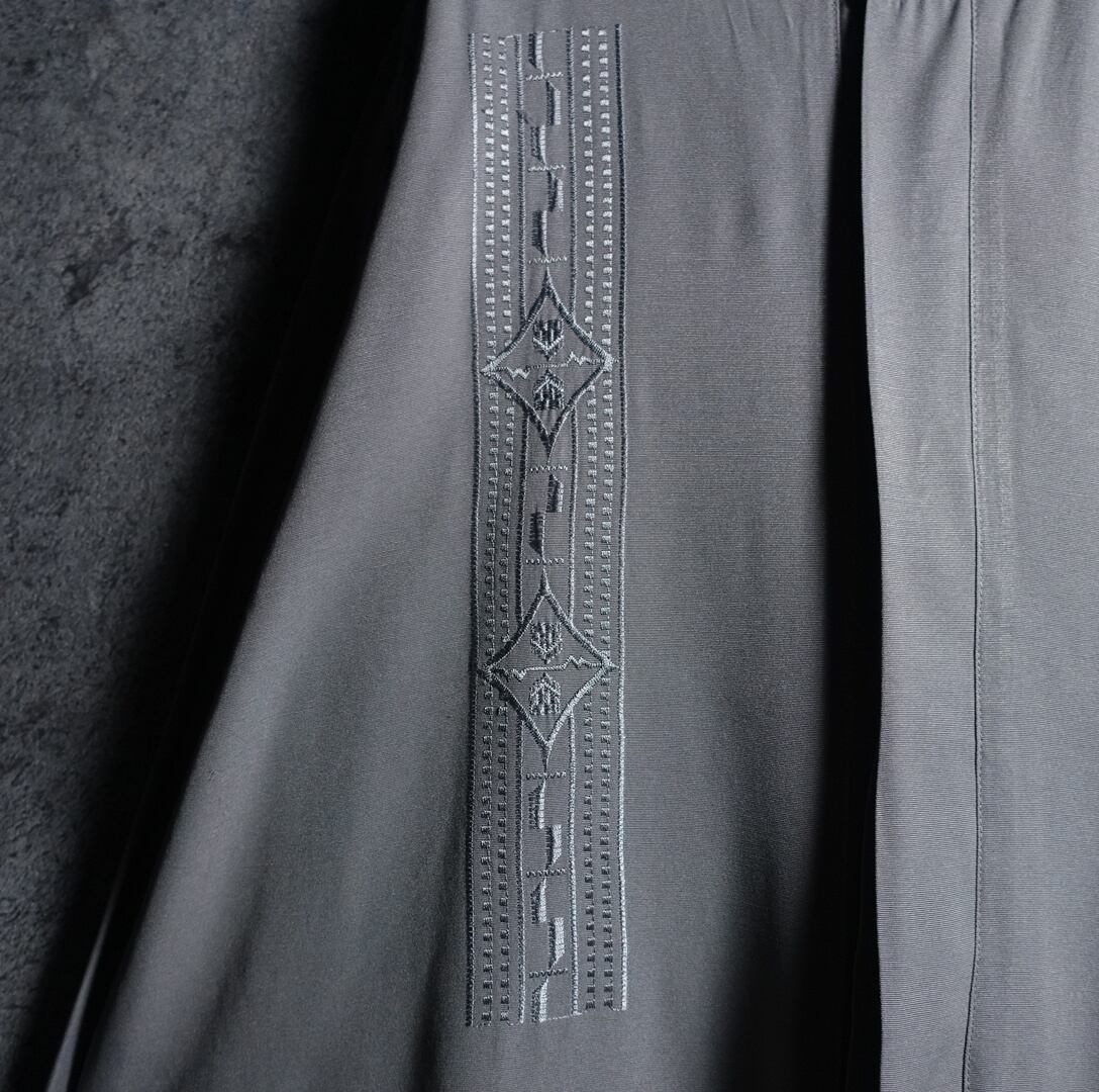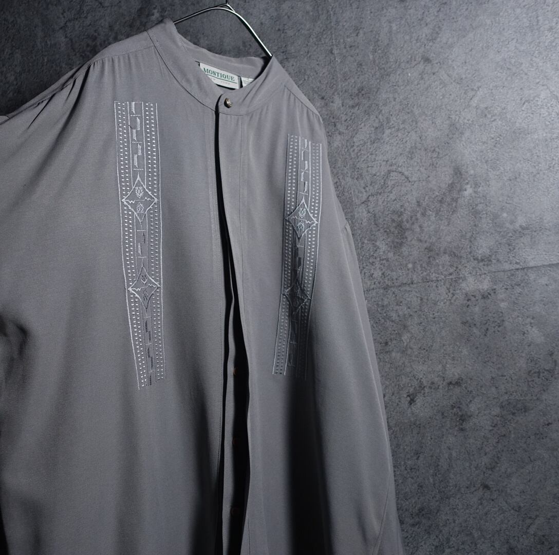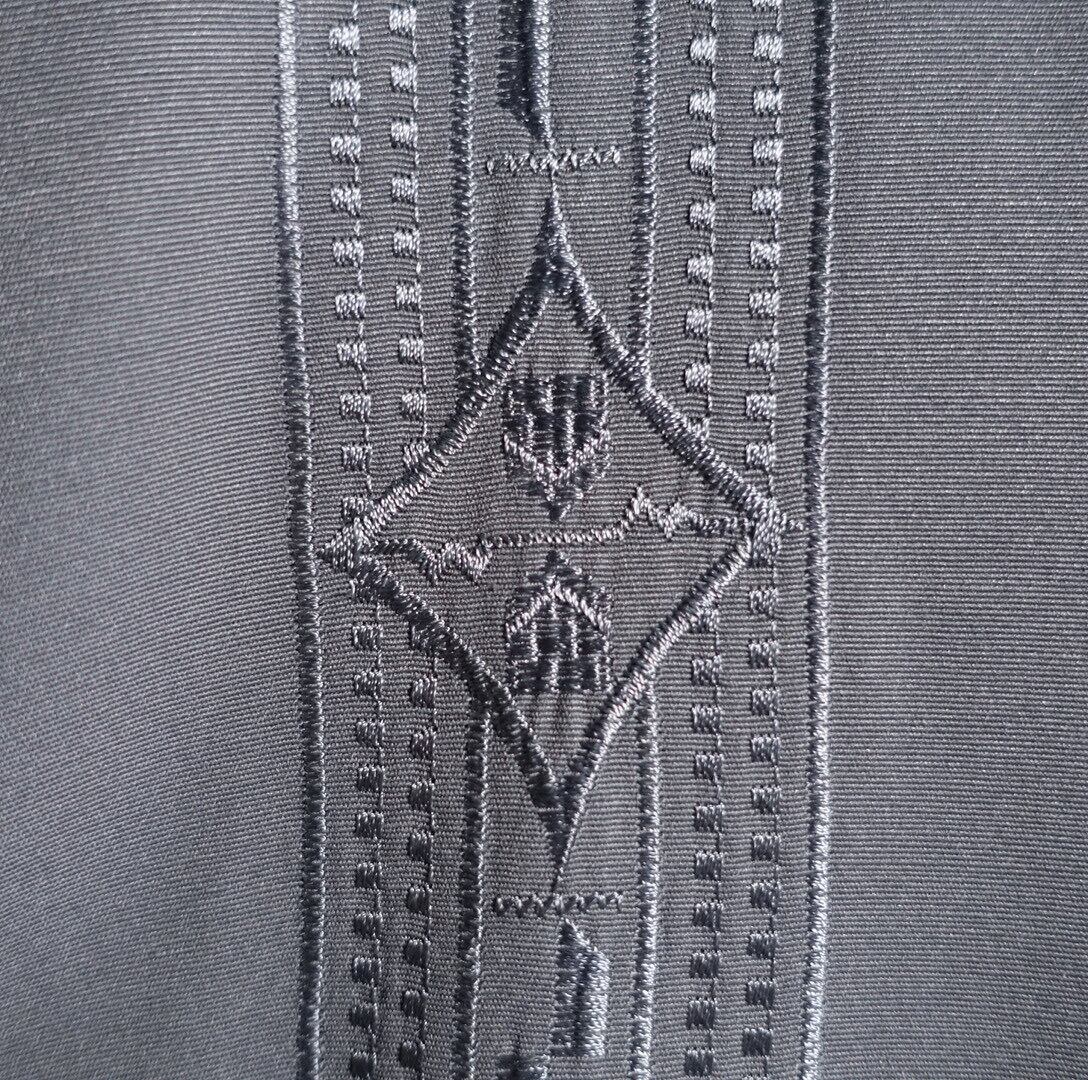 Grey Geometric Motif Embroidered Design Band Collar Rayon Shirt