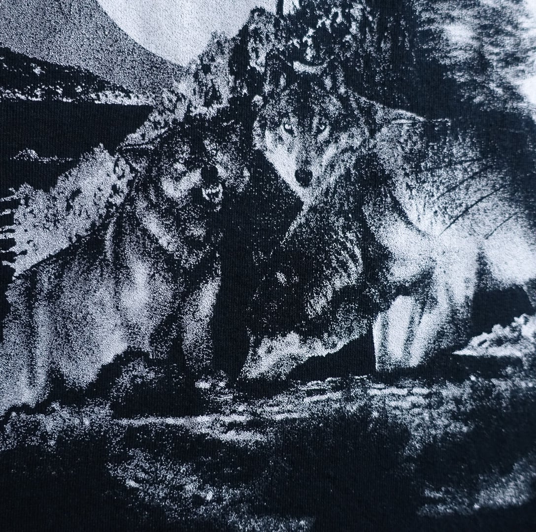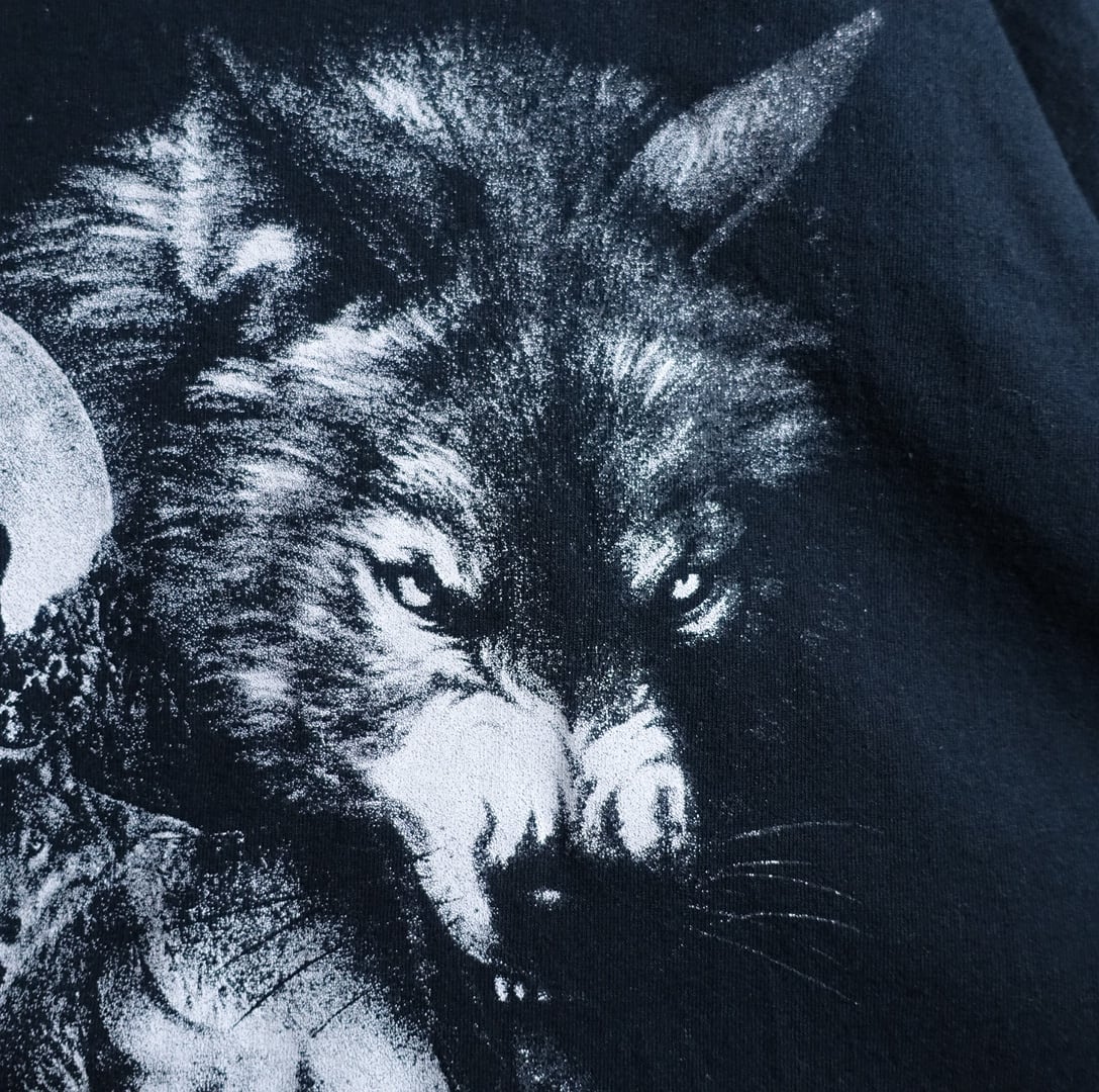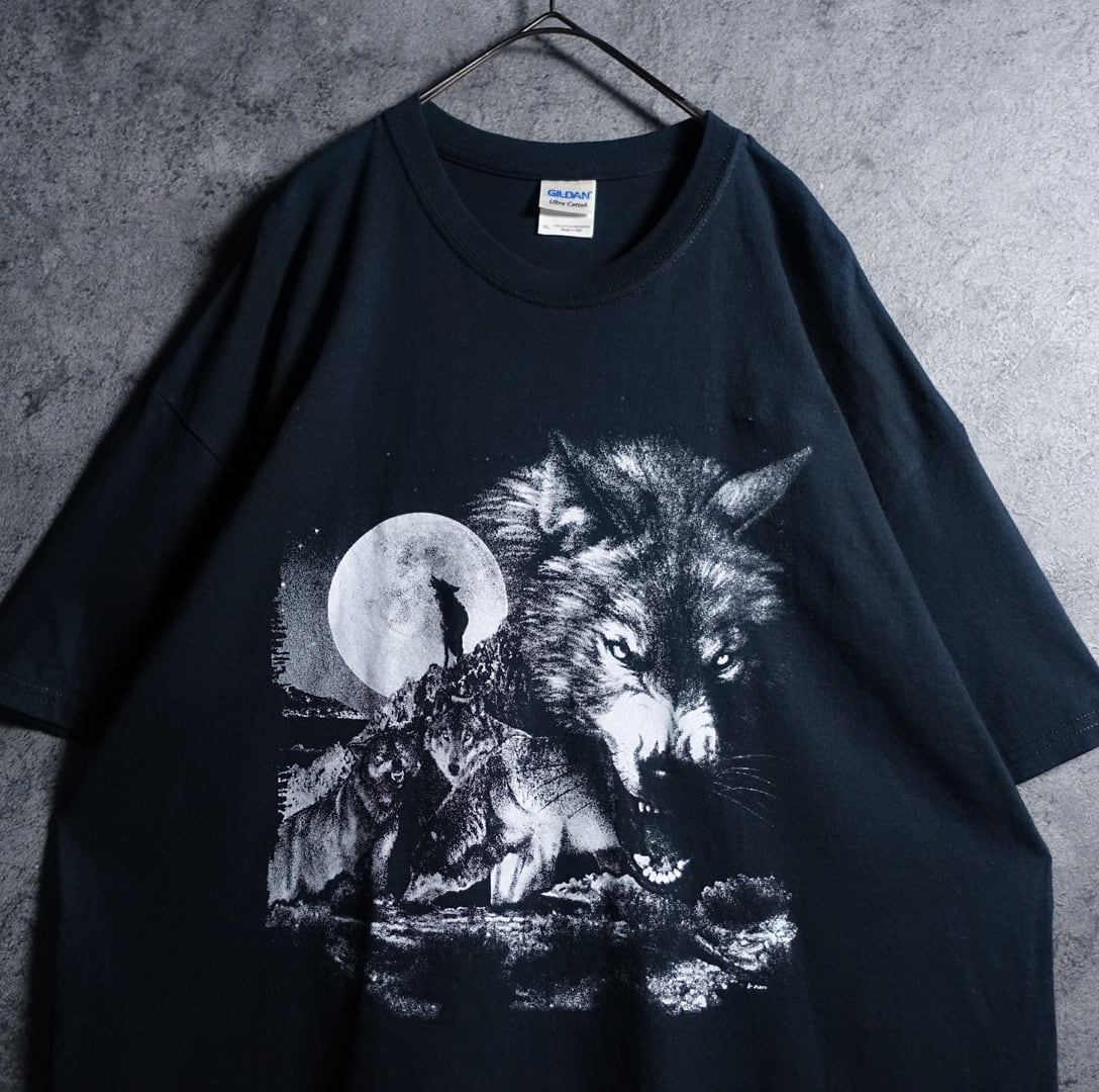 00s “GILDAN”Black Wolf Print Design T-Shirt