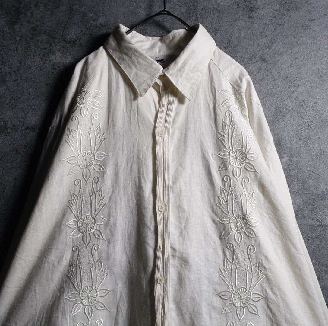 White Flower Motif Embroidered Design Linen L/S Cuba Shirt