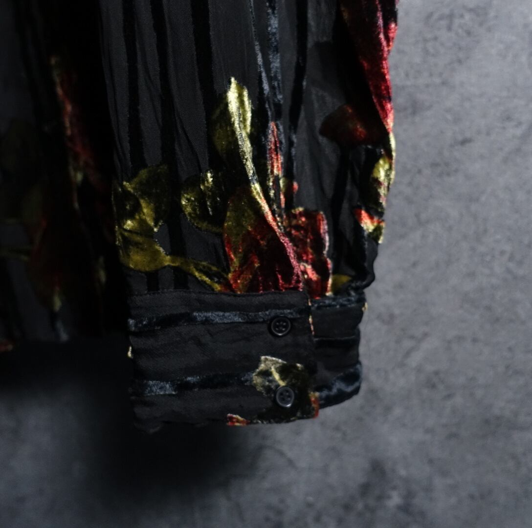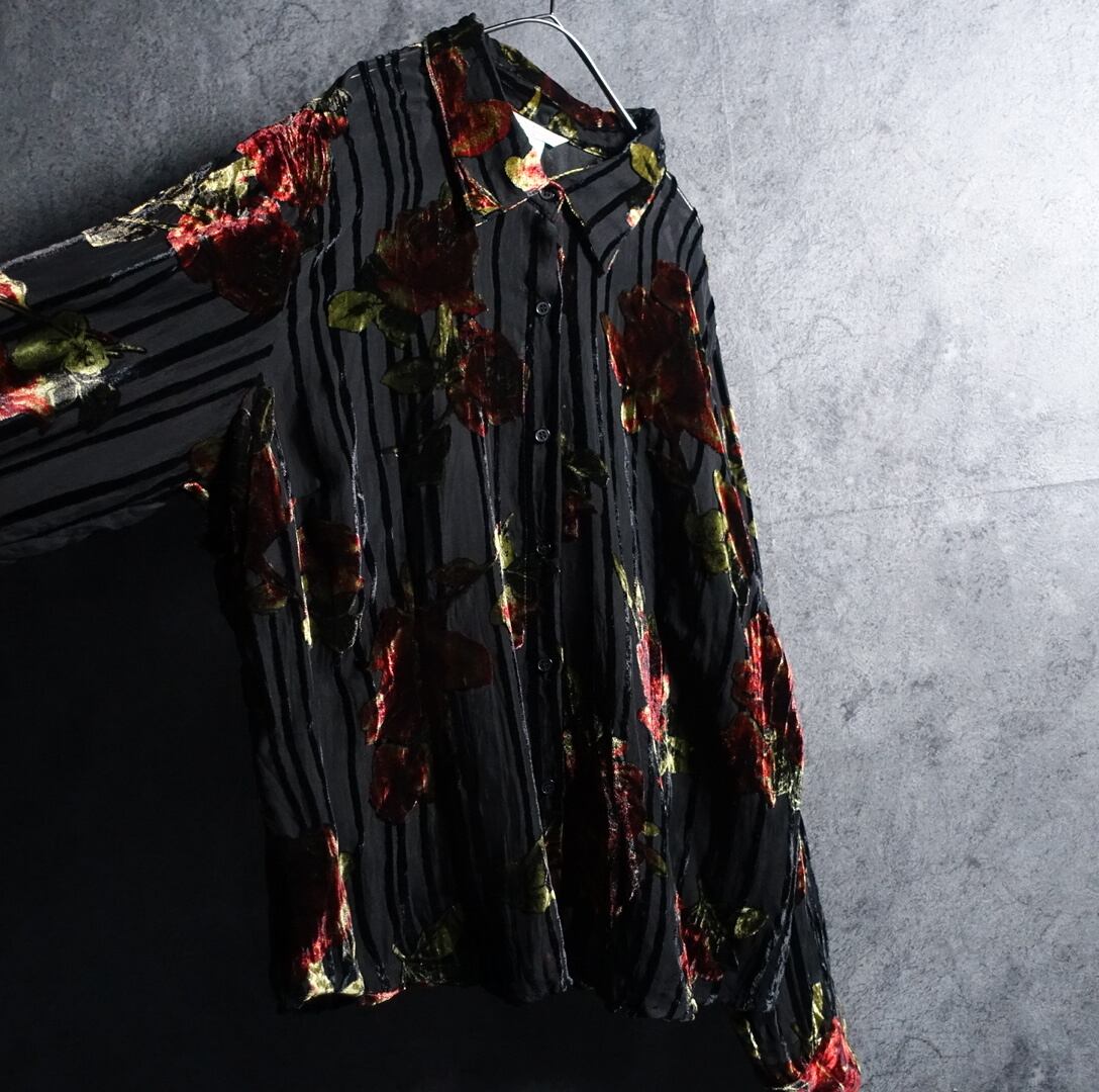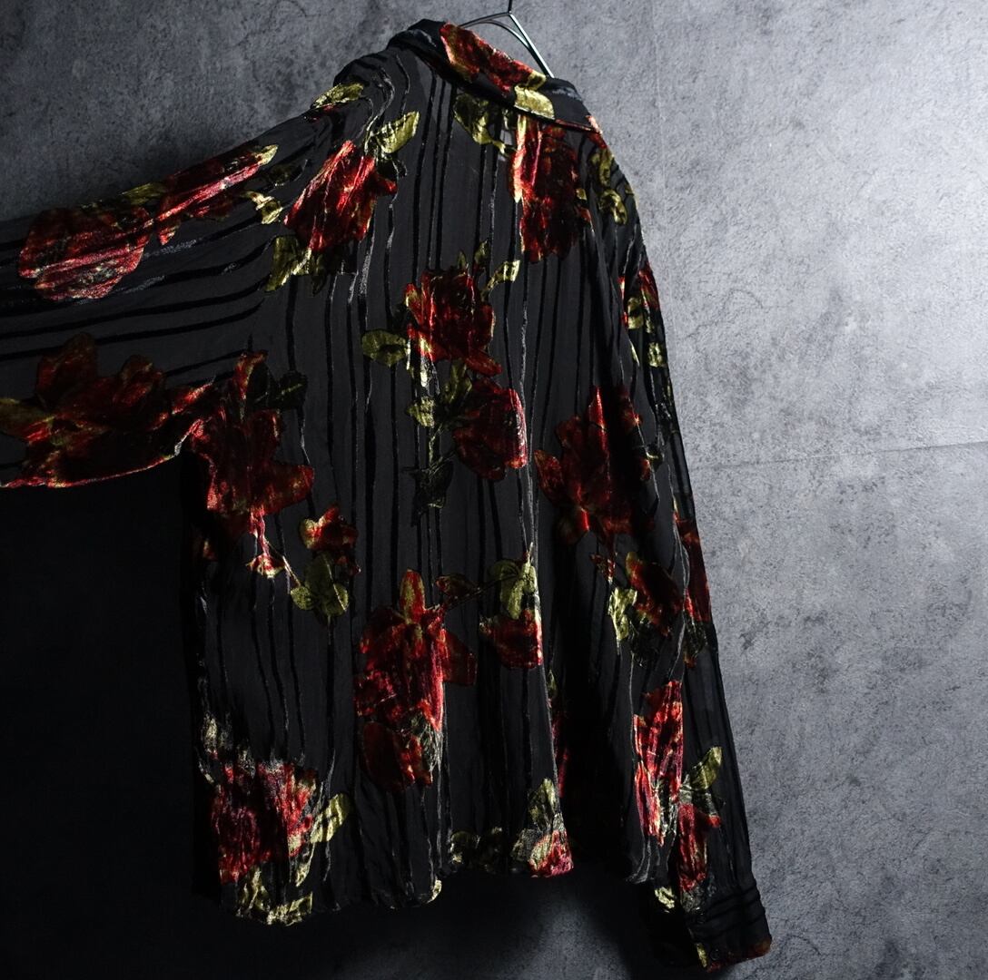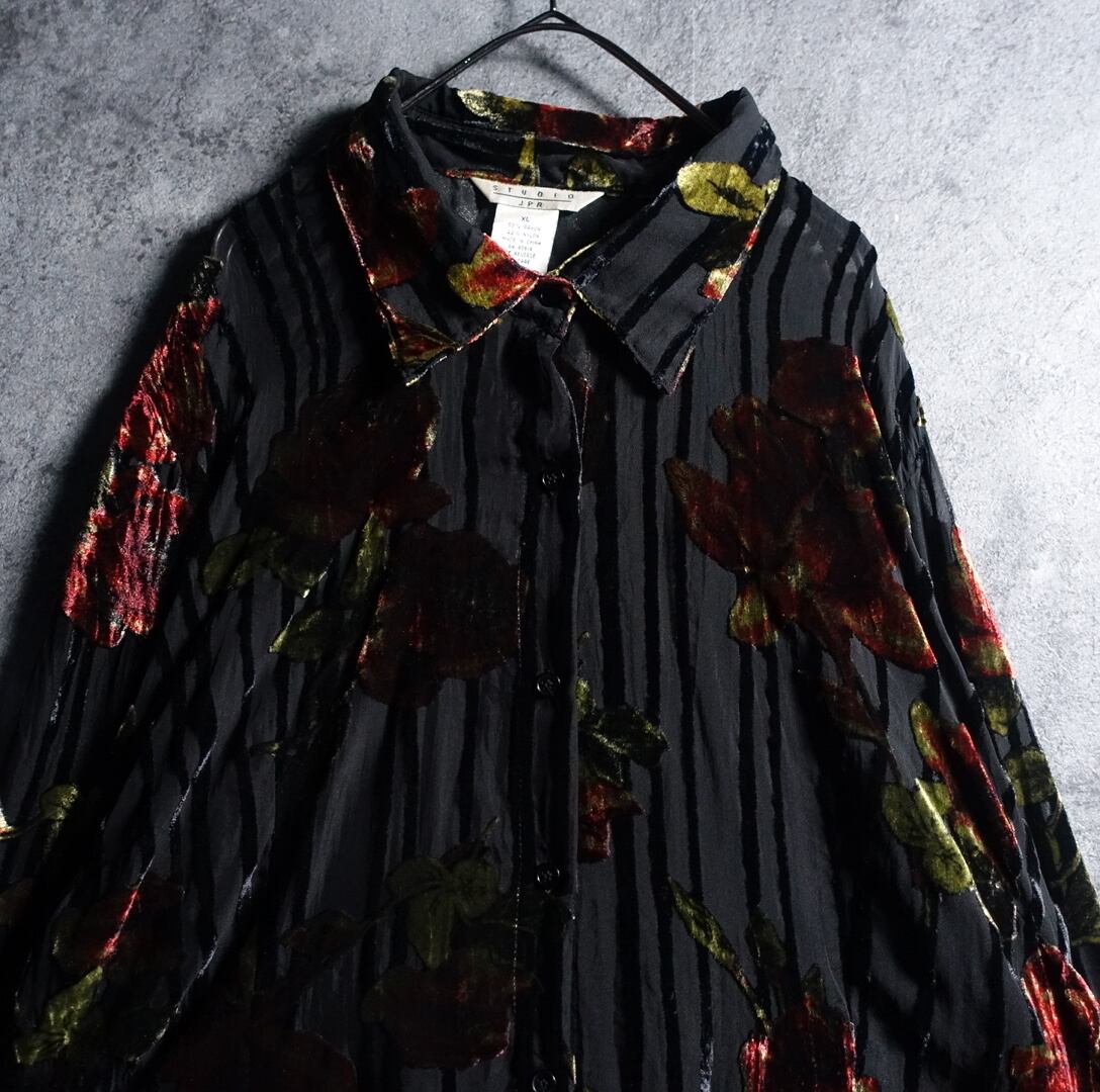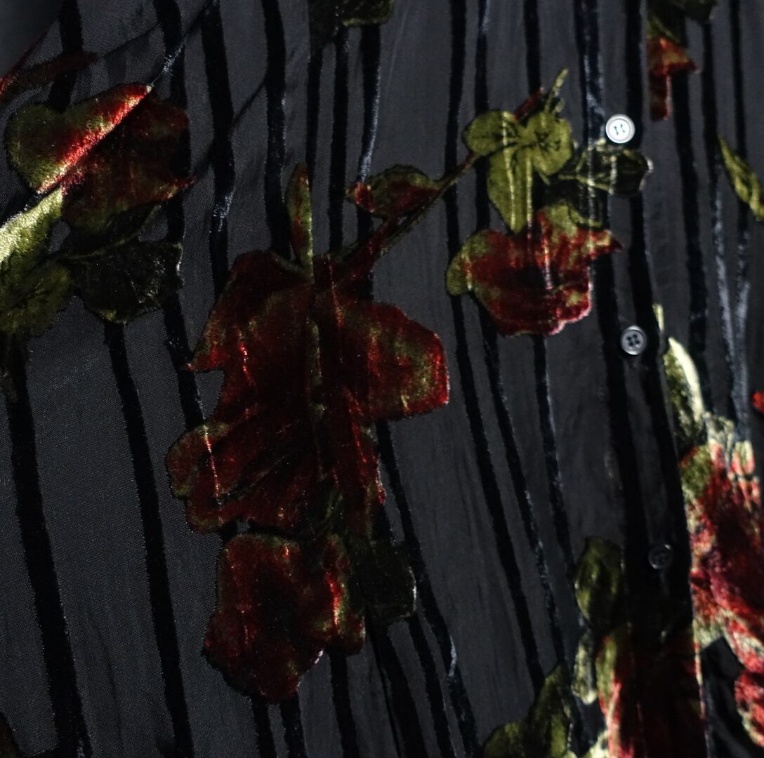 Black Rose Motif Design Velour See-Through Shirt