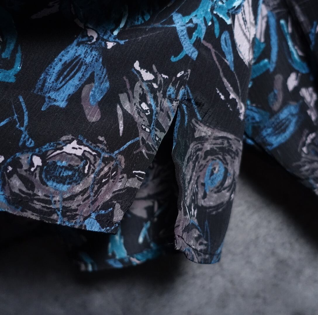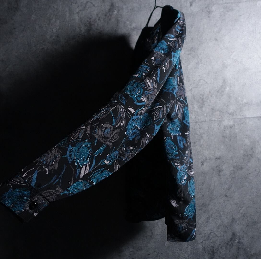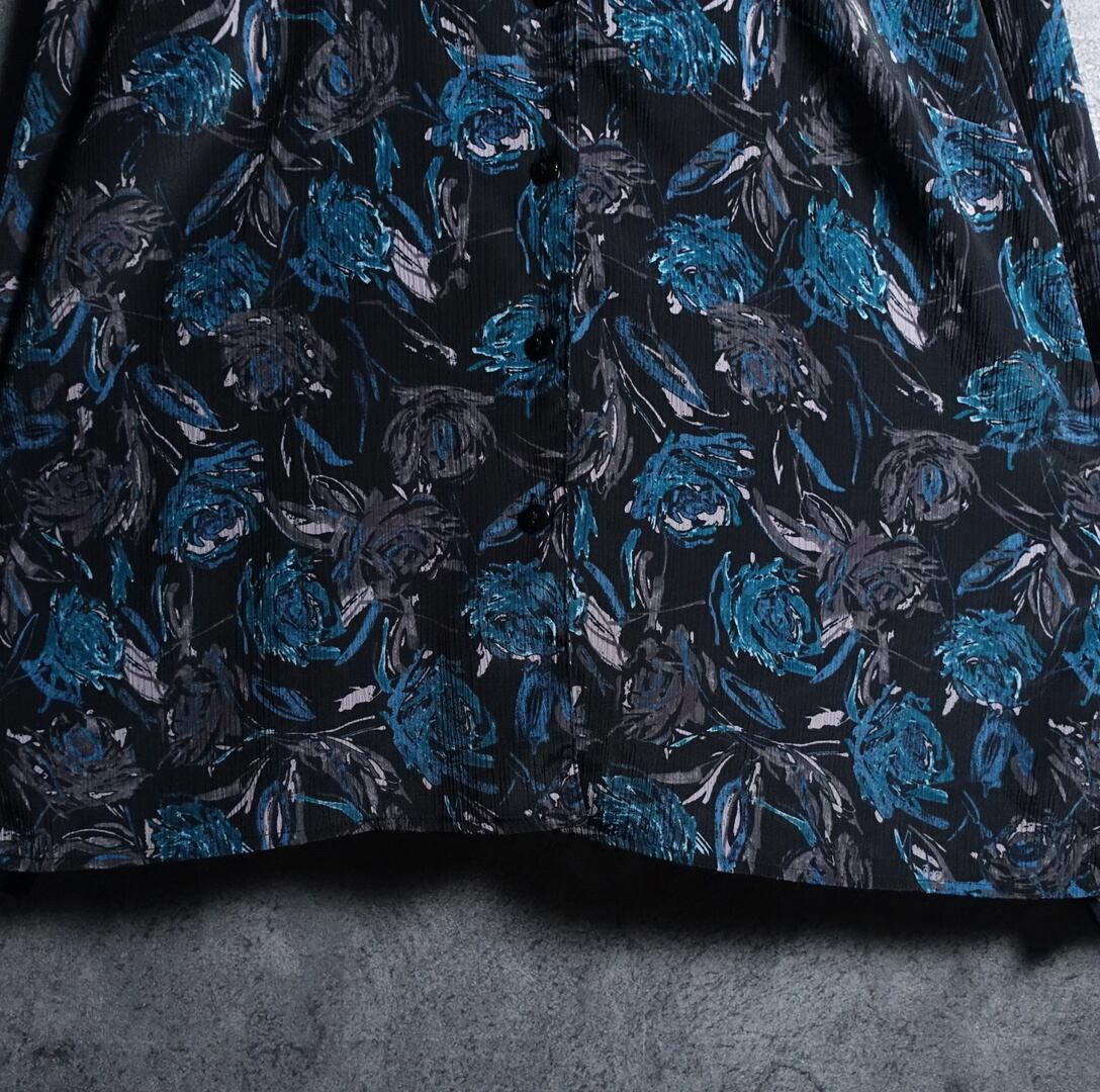 Black Rose Motif Artistic Pattern Wrinkled Design Open Collar Shirt