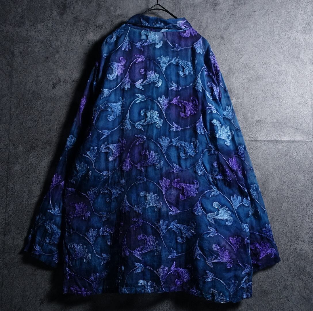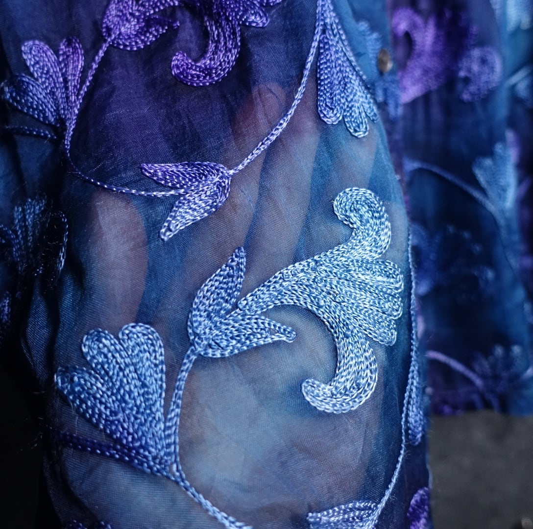 "CHICO'S" Blue & Purple Abstract Embroidered Design See-Through Shirt