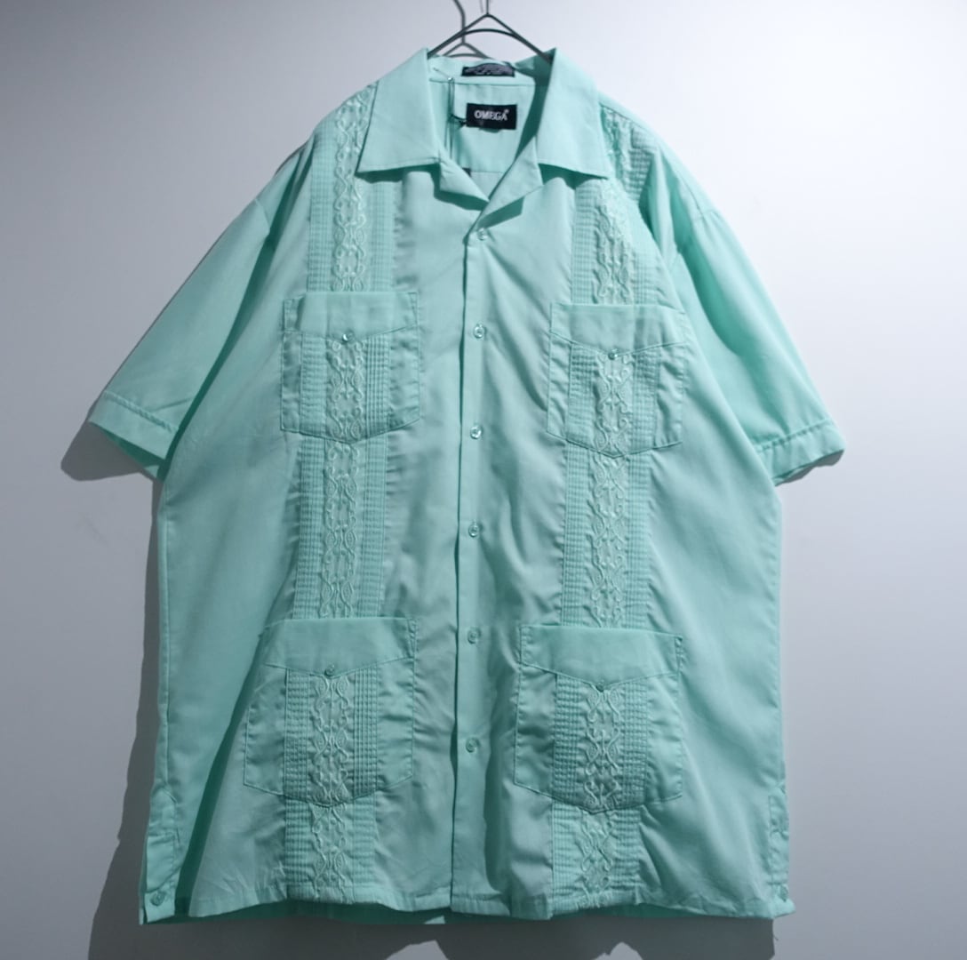 “OMEGA” Mint Green Ornament Embroidery & Pleated Design Cuba Shirt