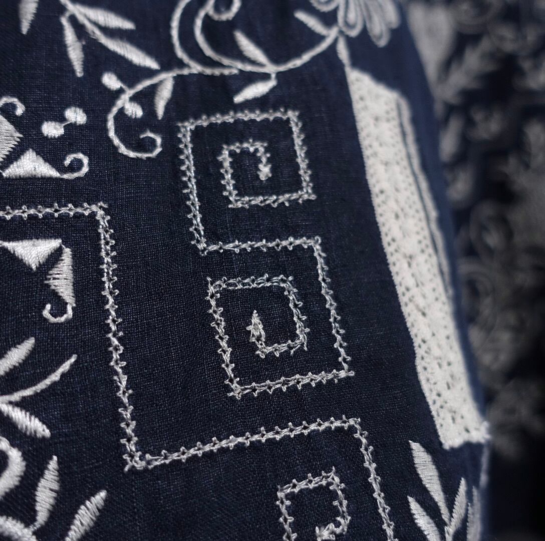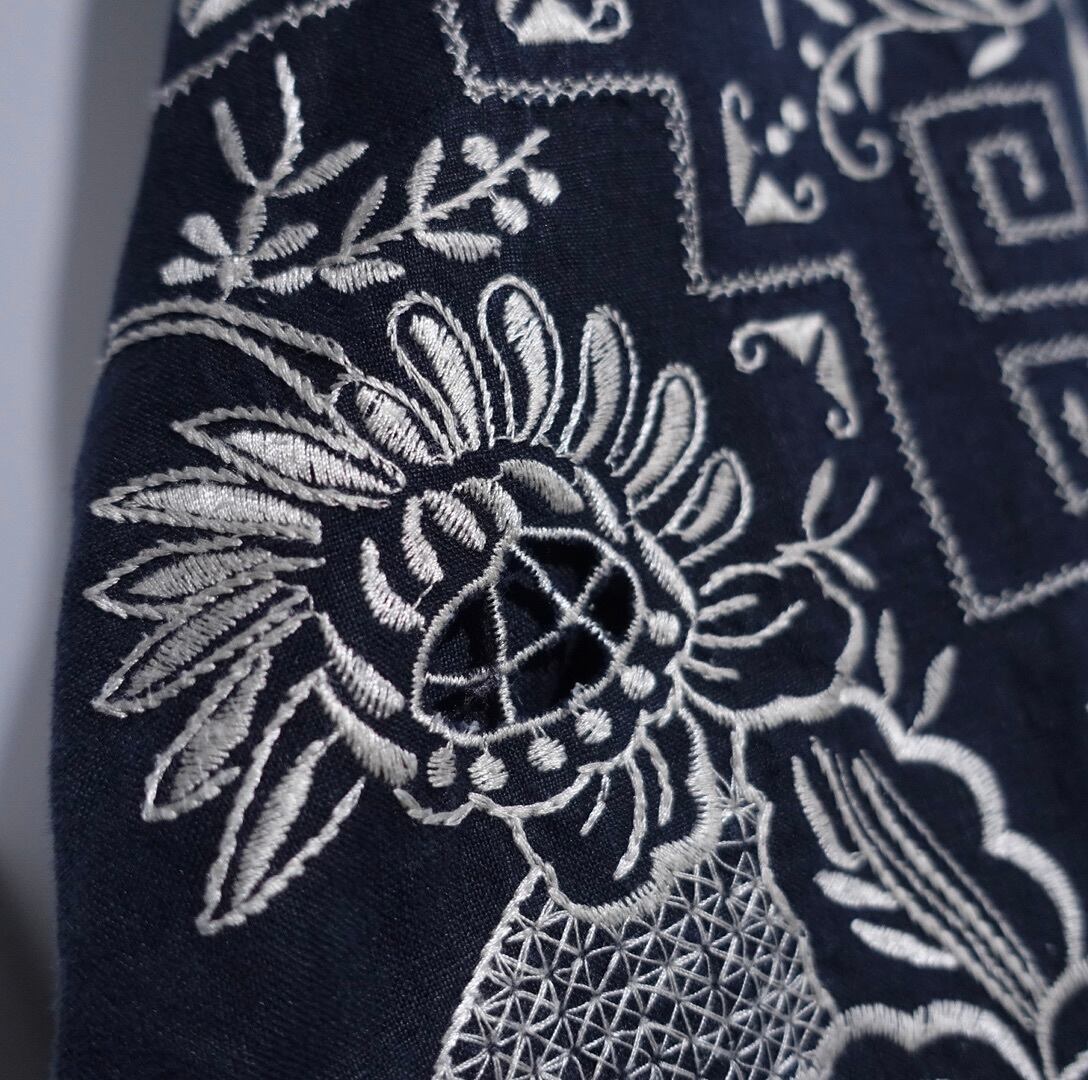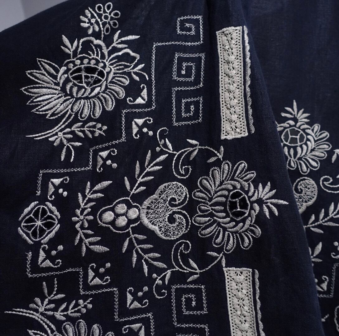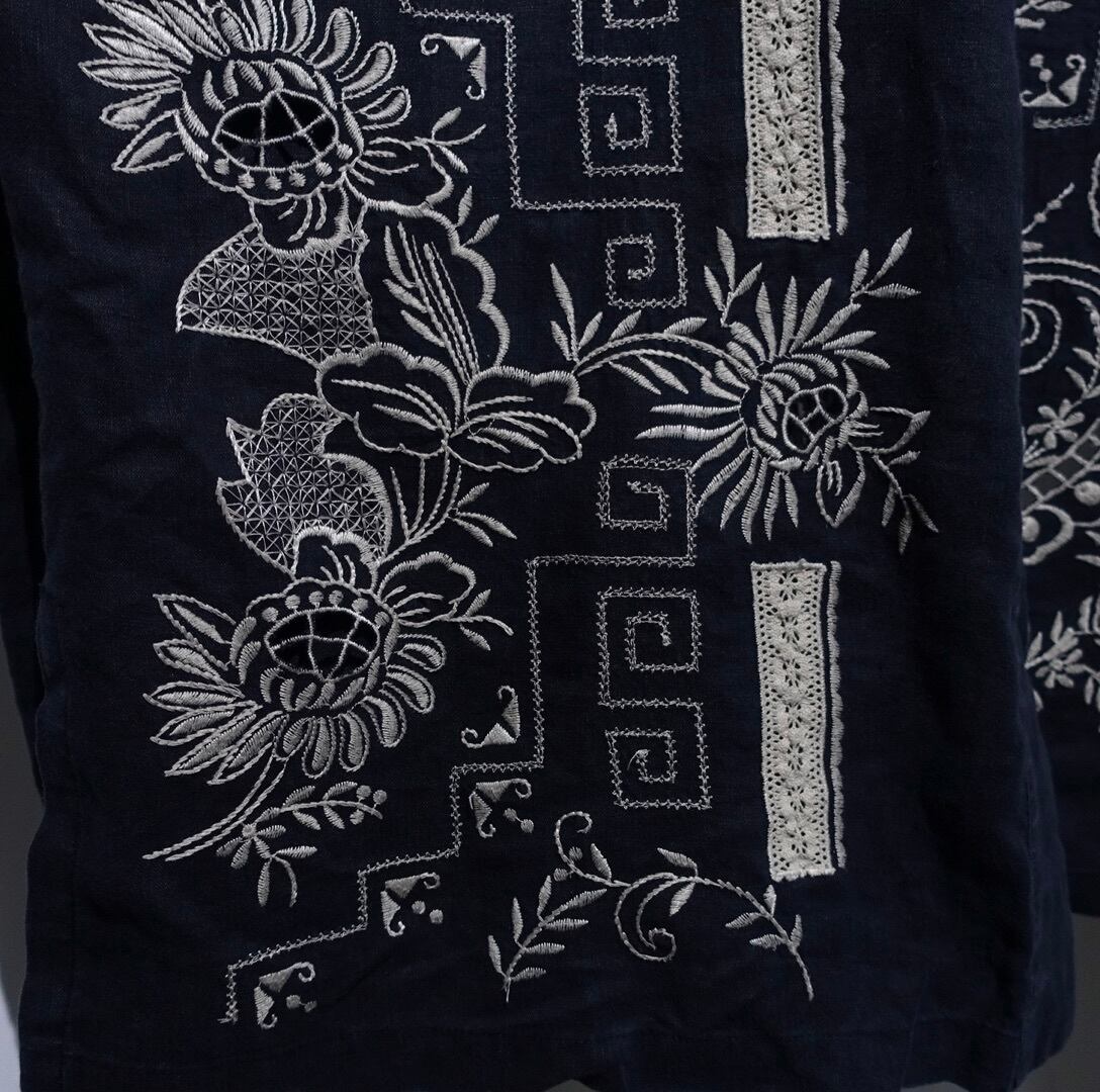 Black Botanical & Geometric Embroidery Design Linen Haori