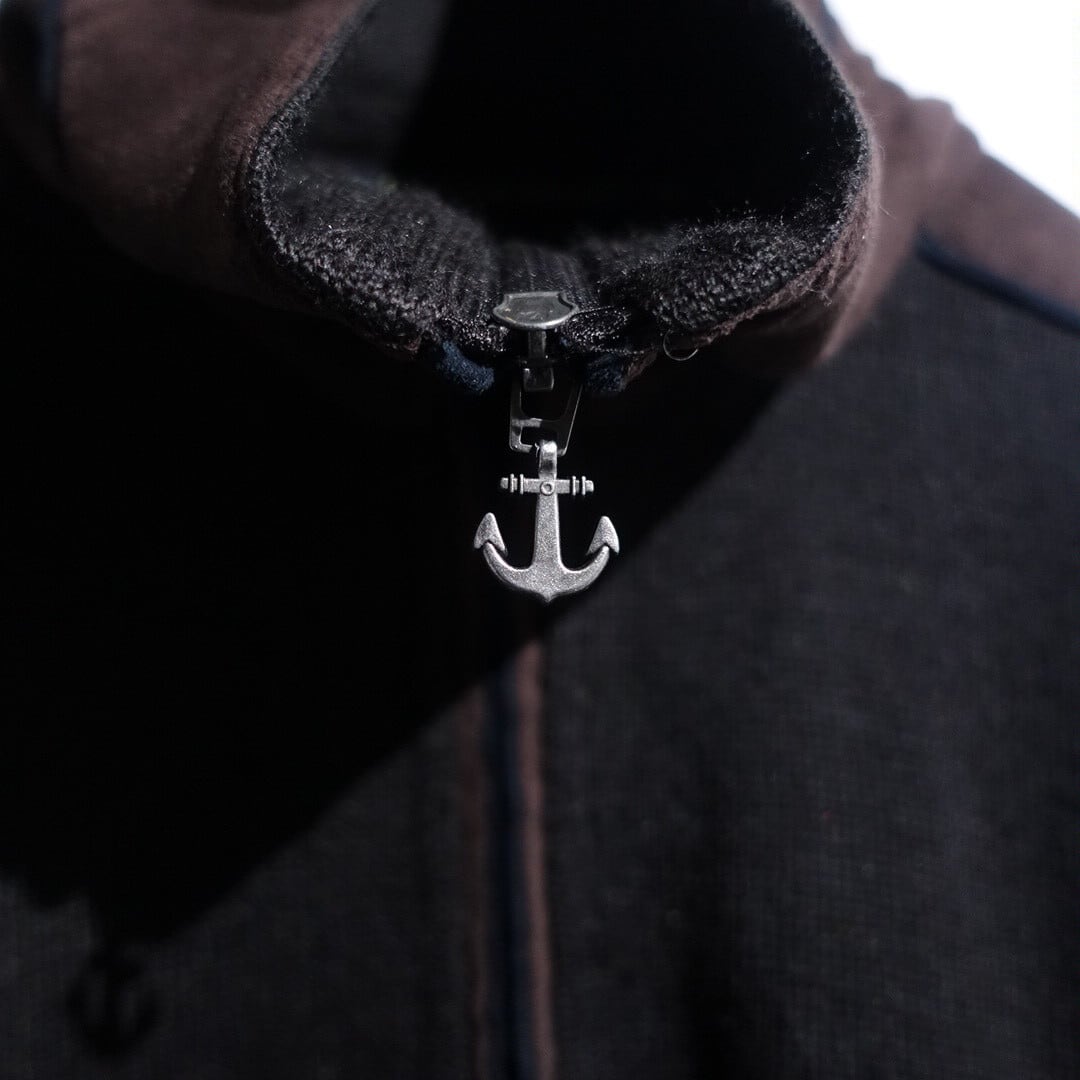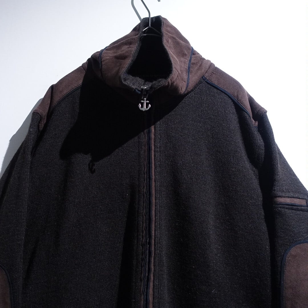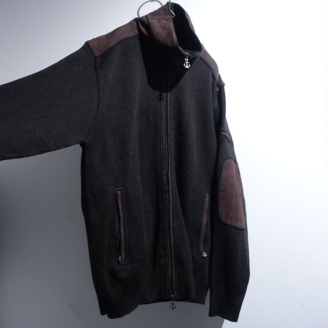 Brown Elbow Patch & Switching Design High Neck Double Zip Knit